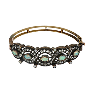 Bracciale rigido in oro giallo e argento la parte centrale contraddistinta da una treccia di diamanti taglio rosa e al centro della quale si alternano 5 opali taglio cabochon ovale piu' altri piccoli sui lati inciso a foglie sui fianchi.