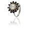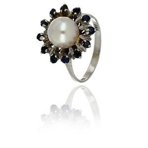 Anello in oro bianco con perla centrale coltivata e piccoli zaffiri a contorno.