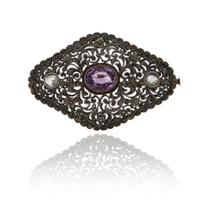 Spilla a rombo in argento e oro con due diamanti tagli rosa ad affiancare un'ametista taglio ovale fine lavoro di traforo e incisione.
