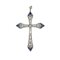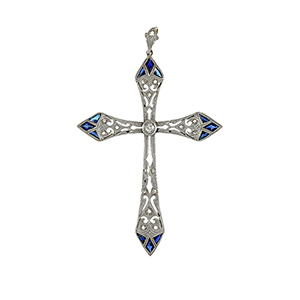 Ciondolo in oro bianco traforato croce cristiana con zaffiri taglio cabochon sui 4 bracci piccolo diamante taglio brillante al centro.