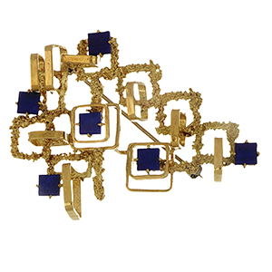 Spilla in oro giallo con particolare design anni '70 quadrati concatenati e ruotati si saldano ad altri con lapislazzuli o corrugati.