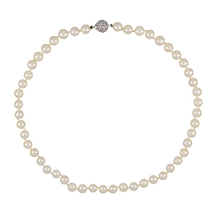 Girocollo di perle giapponesi coltivate fermezza in oro bianco a foggia di pallina interamente pavettata con piccoli diamanti taglio brillante per ct. 1 20 ca.