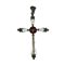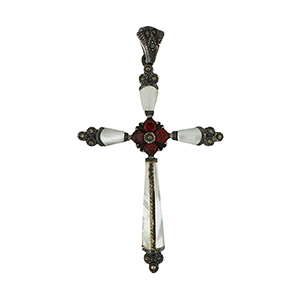 Ciondolo a forma di croce cristiana in argento i bracci in madreperla si chiufono al centro con 4 granati taglio rotondo.