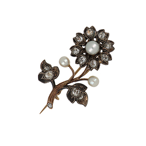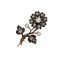 Spilla in oro giallo e argento a forma di fiore piccole perle e diamanti taglio rosa.