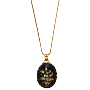 Ciondolo pendente di fine 800 di forma ovale smaltato in nero con bouquet di fiori in oro e diamanti di taglio antico cordoncino e fine chiusura a scatoletta.