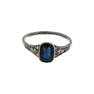 Anello liberty in platino con zaffiro centrale di forma a cuscino taglio misto per stimati ct 1 70 ca (8 25 x 5 99 x 3 66 mm) piccoli diamanti di taglio antico e 8/8 terminano la decorazione dei fianchi.