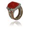 Anello decò in oro rosso e decorazioni a traforo in platino con corallo rosso aranciato di forma ottagonale taglio a cabochon e diamanti di contorno di forma rotonda taglio 8/8.