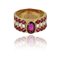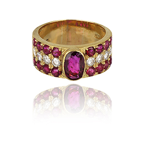 Anello a fascia in oro giallo decorato con rubini e diamanti taglio brillante per rispettivamente ct.1 20 e 0 70 ca. al centro un rubino ovale di ct. 1 00 ca.