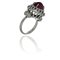 Anello in oro bianco a cestino con rubino centrale di forma rotonda taglio cabochon di stimati 5 20 ct. (9 87 x 5 64 mm) e diamanti 8/8 a contorno.