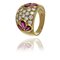 Anello a fascetta bombata in oro giallo 6 gocce di rubino per ct. 1 00 ca. si contrappongono a un pavè di diamanti taglio brillante al centro per ct. 0 90 ca.