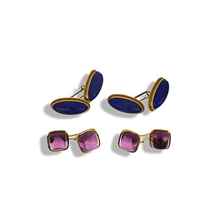 Lotto composto da due coppie di gemelli in oro giallo con ametiste taglio cabochon una e lapislazzuli l' altra.