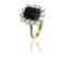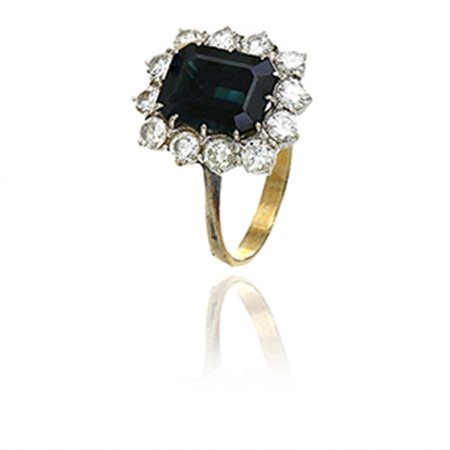 Anello in oro bianco zaffiro taglio smeraldo di stimati ct. 3 00 è contornato da 12 diamanti taglio brillante per complessivi ct. 1 20 ca.