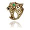 Anello a forma di testa di pantera stilizzata in oro giallo a 9kt gli occhi verdi sono in granato tzavorite e il naso in onice sfaccettato.