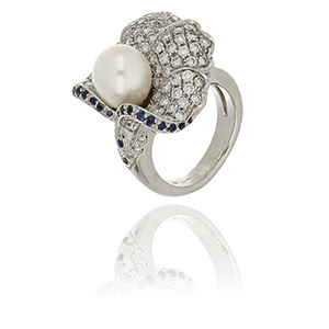 Anello in oro bianco a raffigurare un fiore con perla coltivata australiana di 10 50 x 9 71 mm e grande pavè di diamanti per stimati 2 40 ct piccolo bordo in zaffiri.