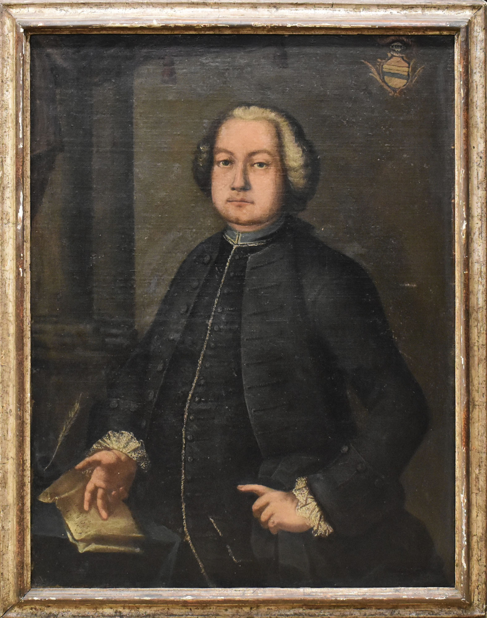 'Personaggio con libro e stemma in alto a destra' olio su tela sec.XVII