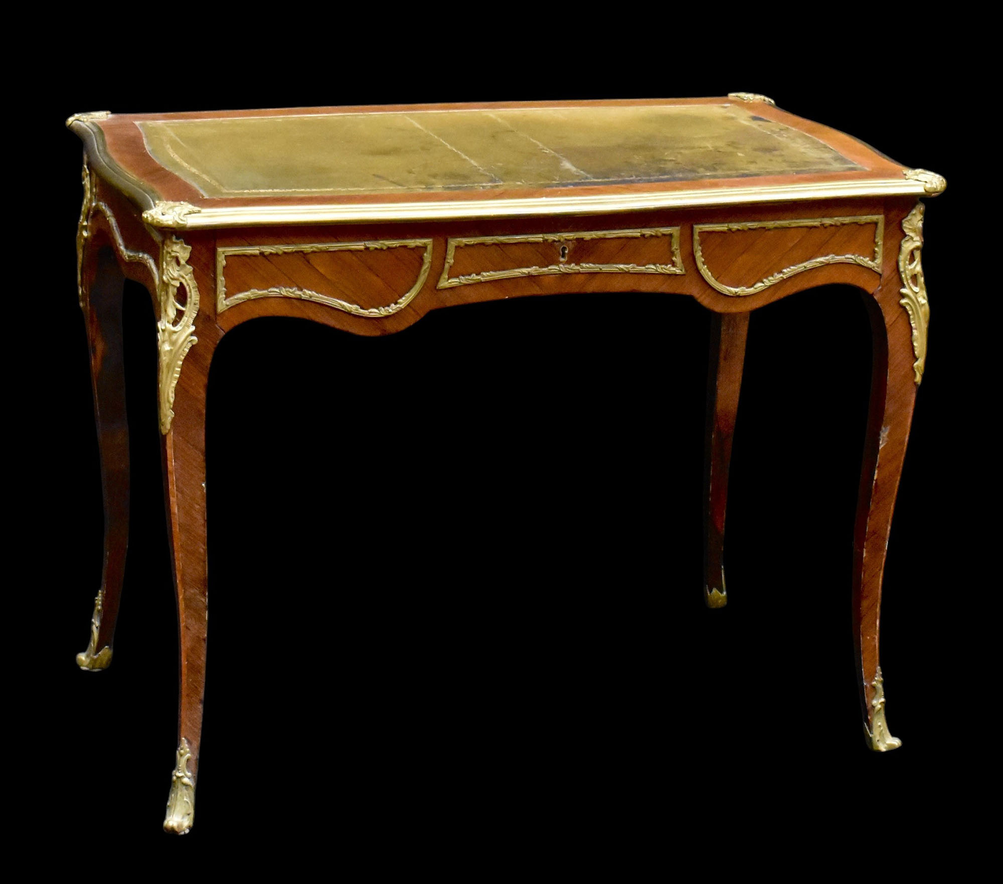 Scrittoio da centro con cassetto nella fascia gambe mosse e guaniture in metallo dorato piano con riserva in pelle (difetti)