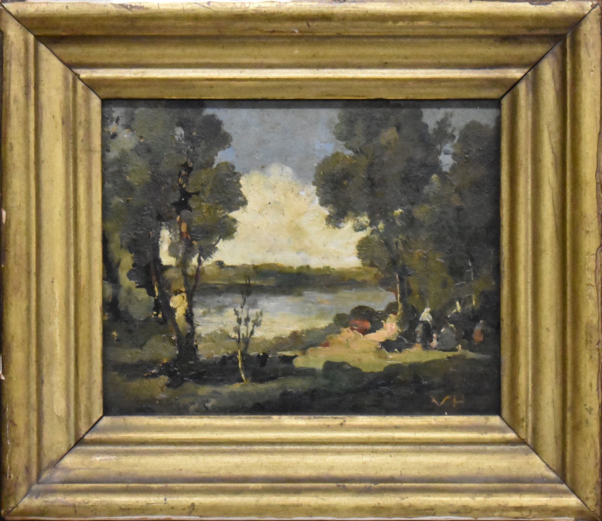 'Paesaggio con personaggi e corso d'acqua' olio su tavola monogrammato VH in basso a destra