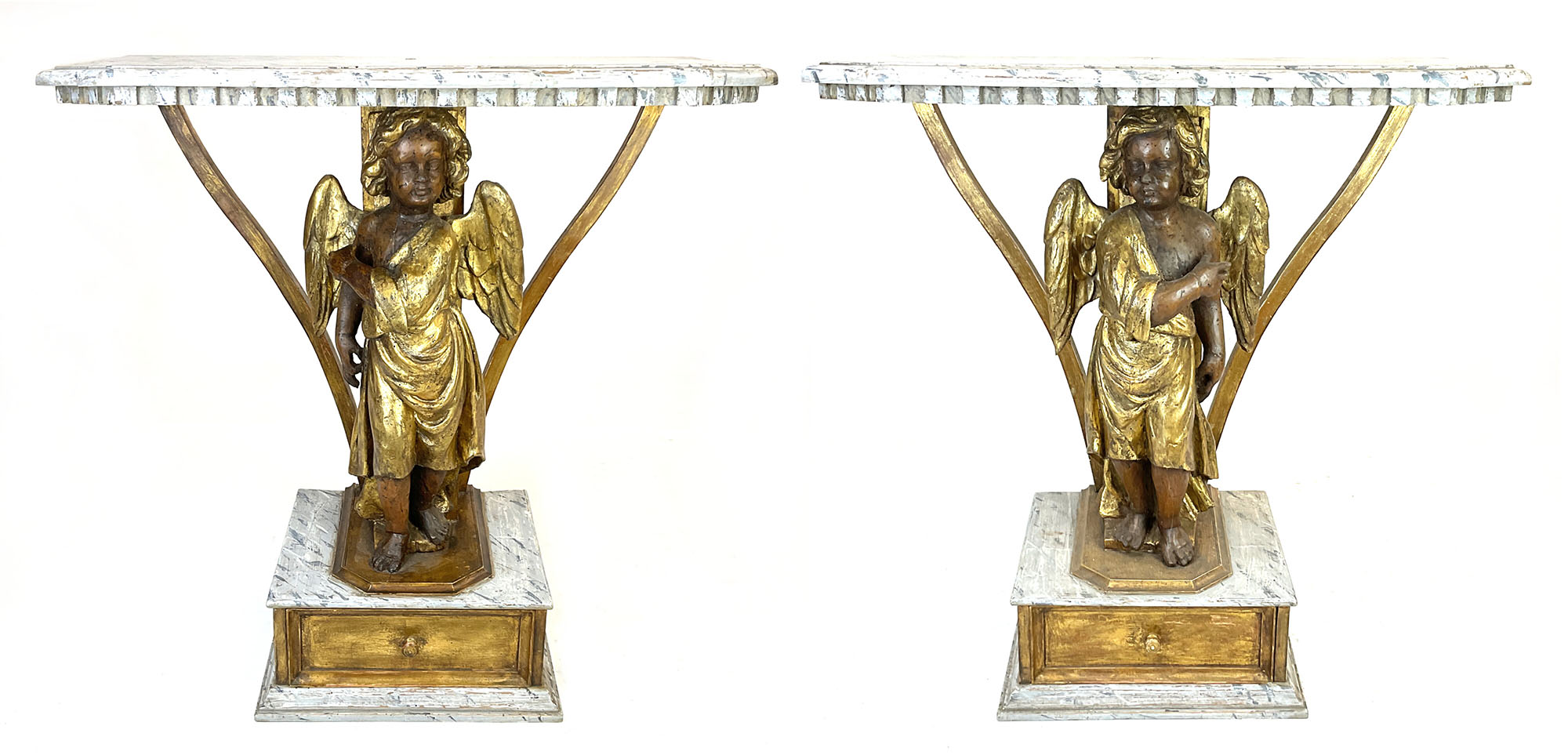 Coppia di consolle in legno dorato e dipinto a finto marmo con cassetto alla base sostegni ricavati da due angeli del sec.XVIII in legno intagliato e dorato a mecca (difetti mancanze e restauri)
