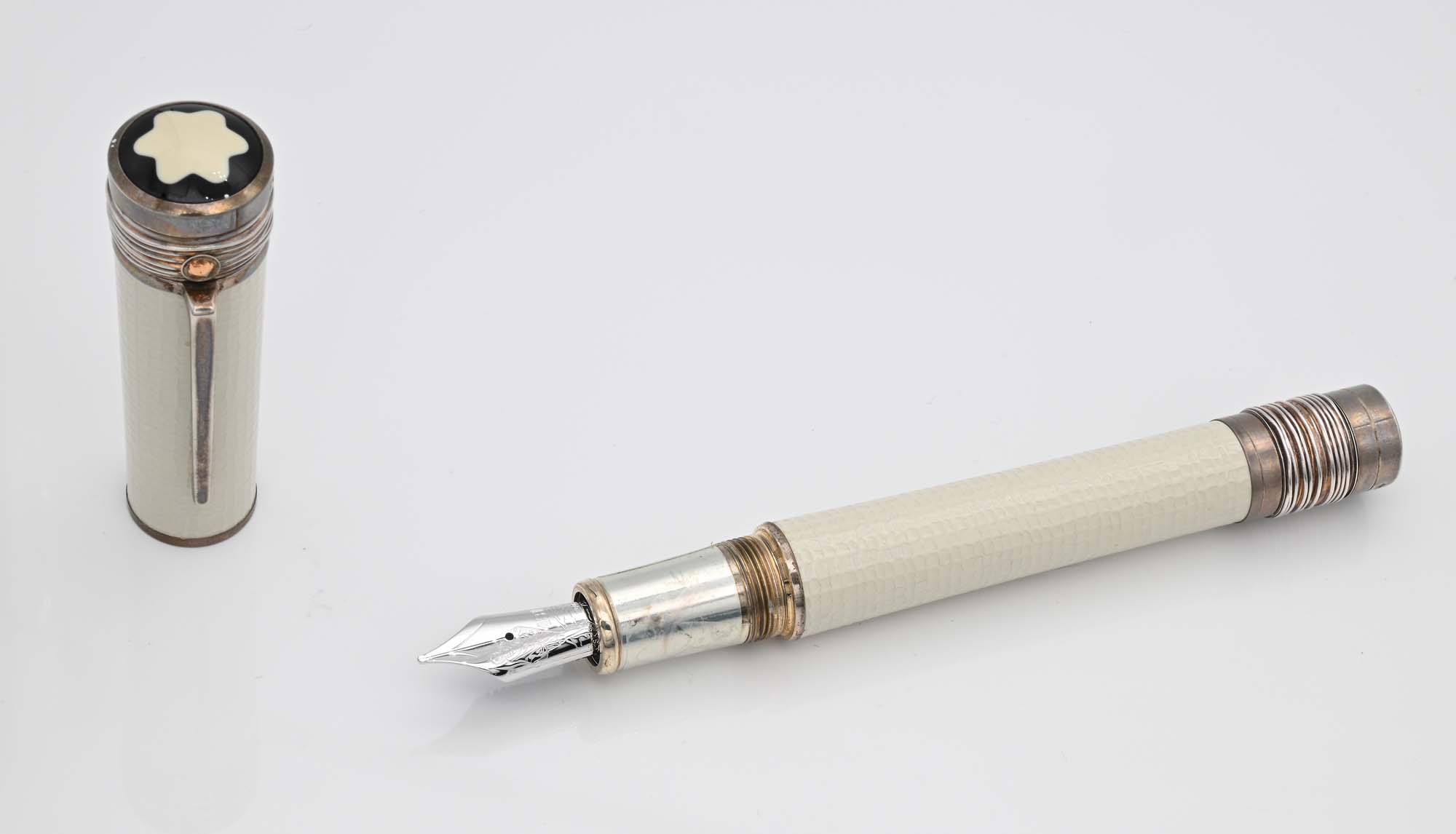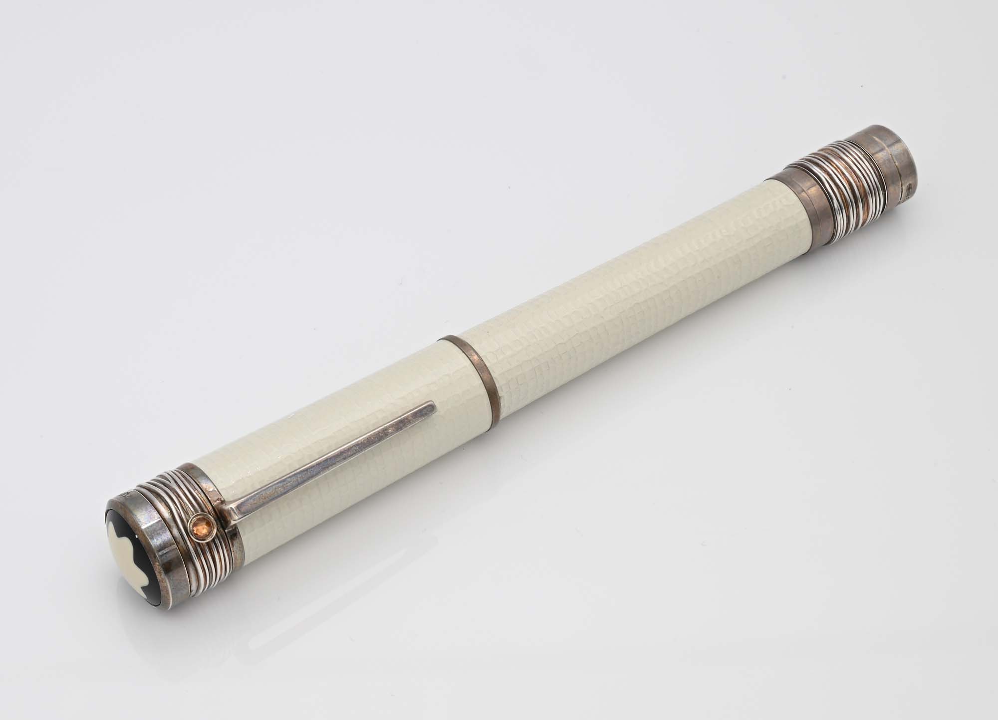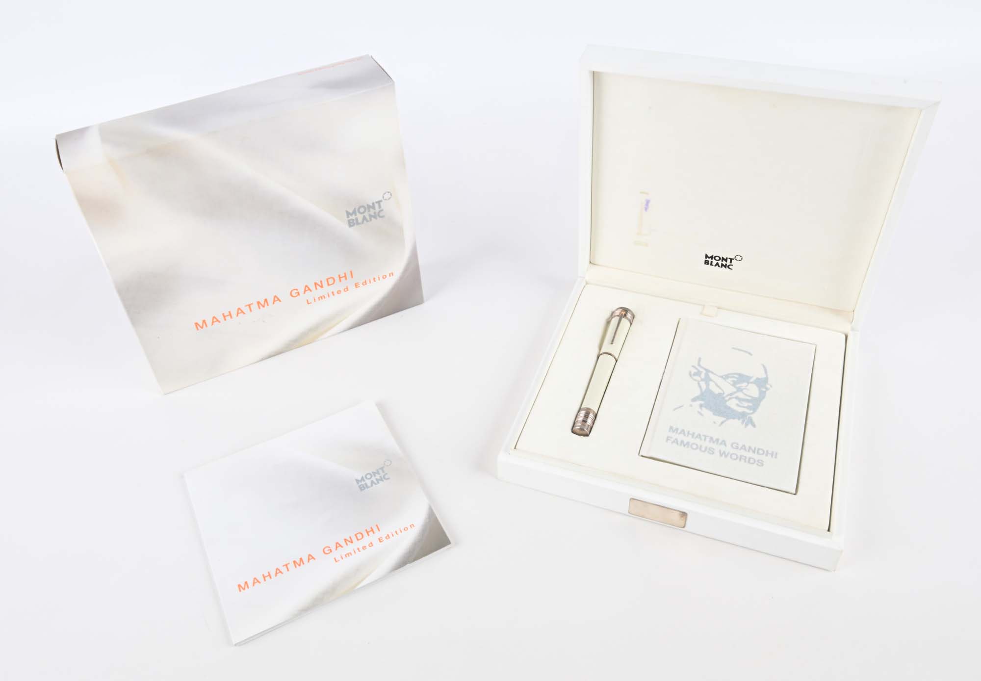 Montblanc Mahatma Gandhi Limited Edition 3000 (105591) - Penna Stilografica in argento 925/000 e lacca bianca con granato mandarino Mod. 28782 2009 Come nuova. Mai usata. Fondo di negozio con plastica protettiva. Nr. KU1722765 Pennino M in oro bianco 18Kt. Entro astuccio di pelle con scatola di cartone, istruzioni e garanzia della penna e della pietra e libretto di Gandhi originali