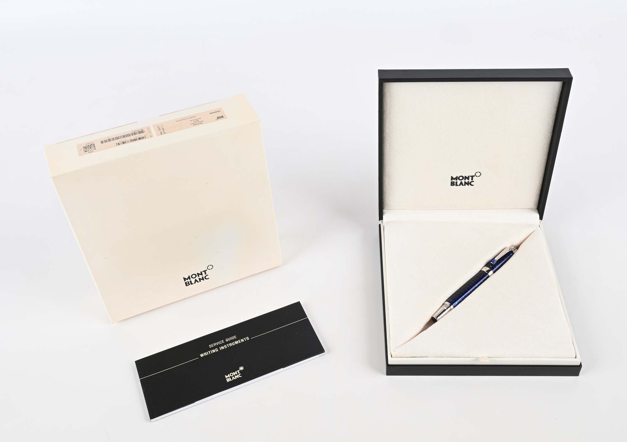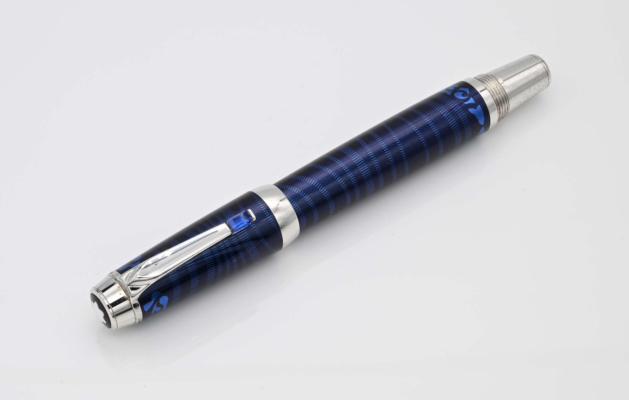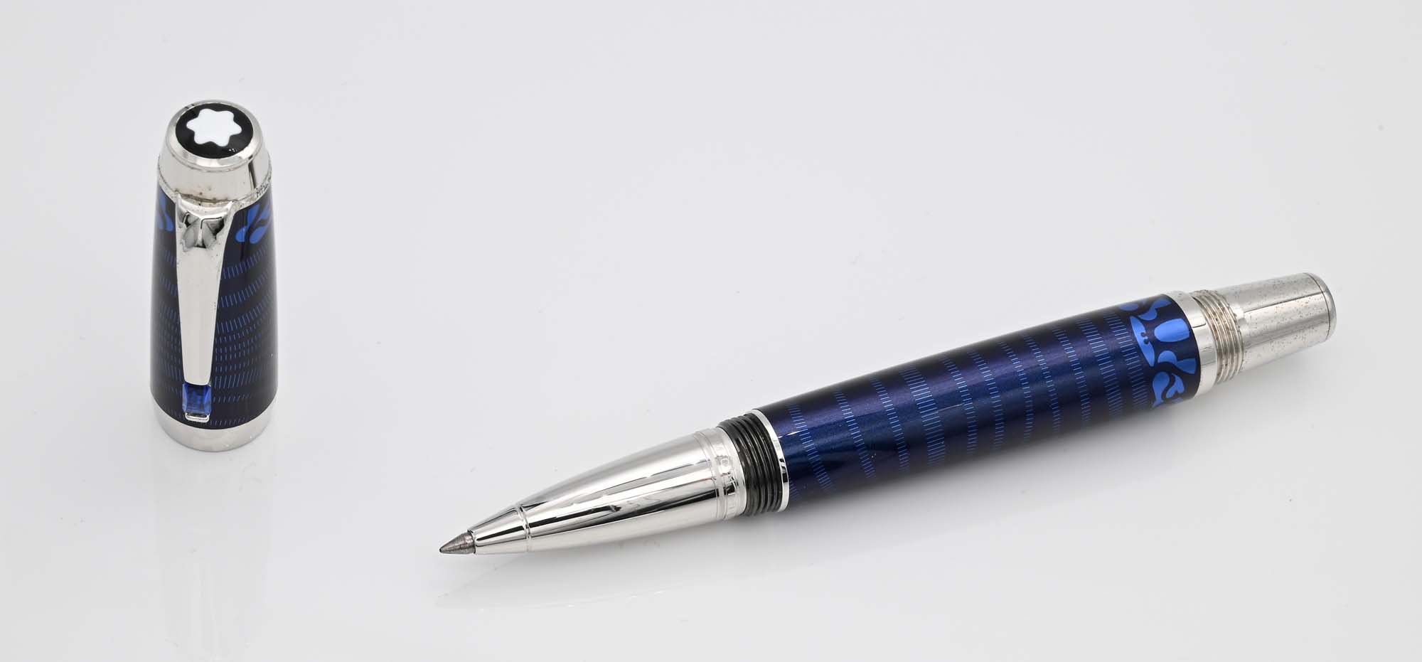 Montblanc Bohème Paso Doble Bleu 104920 - Roller in metallo con finiture platino e pietra color zaffiro, con lacca bleu incisa con motivo ispirato alla danza del Paso Doble Mod 25578 Come nuova. Mai usata. Fondo di negozio. Nr. MT1634274 Entro astuccio con scatola di cartone, istruzioni e garanzia originali. Con controscatola di cartone originale