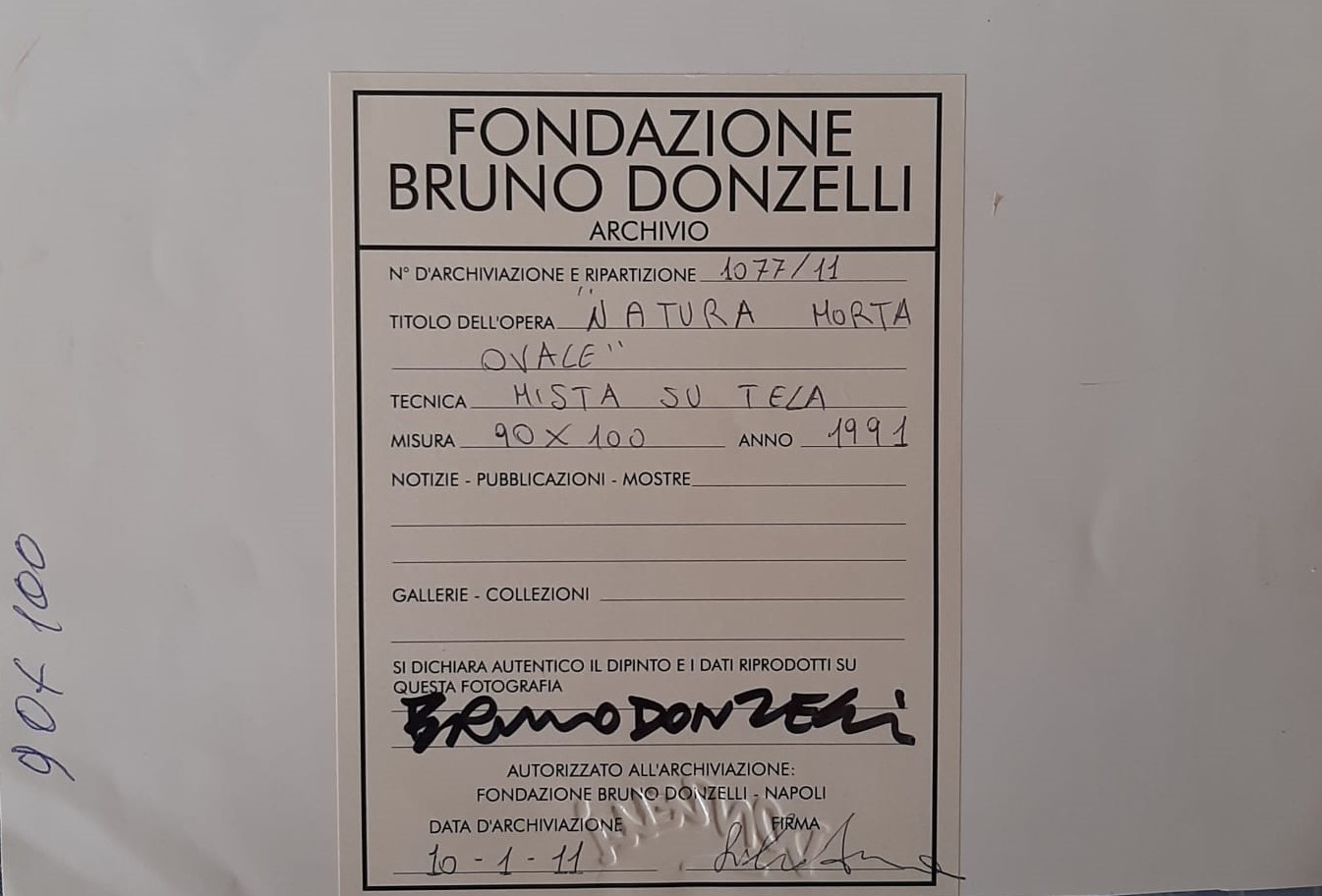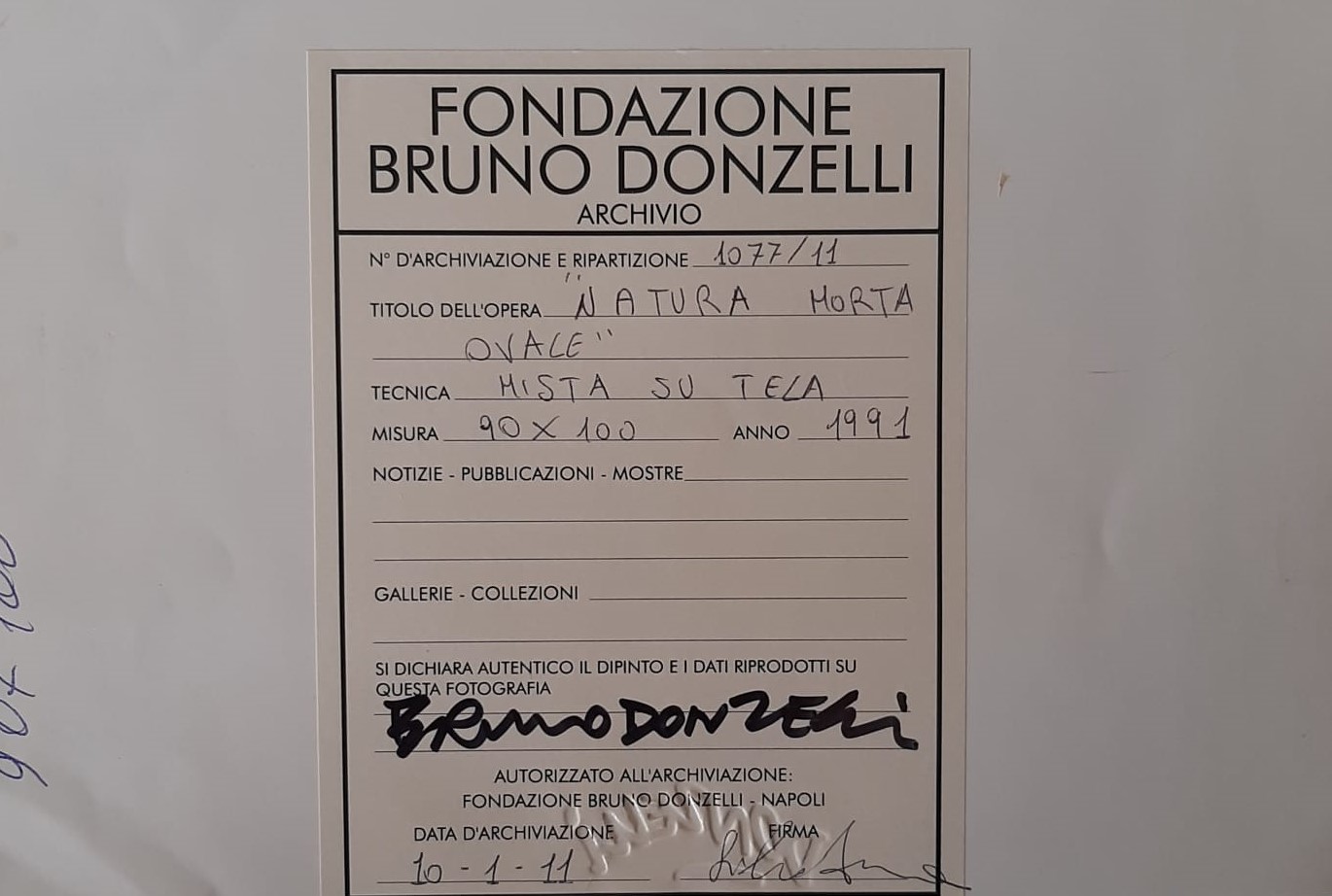 Bruno Donzelli (Napoli 1941). Natura morta ovale,1991. Tecnica mista su tela. L'opera è accompagnata da Autentica su fotografia della Fondazione Bruno Donzelli. Numero di archiviazione e ripartizione 1077/11. Cm. 90x100.