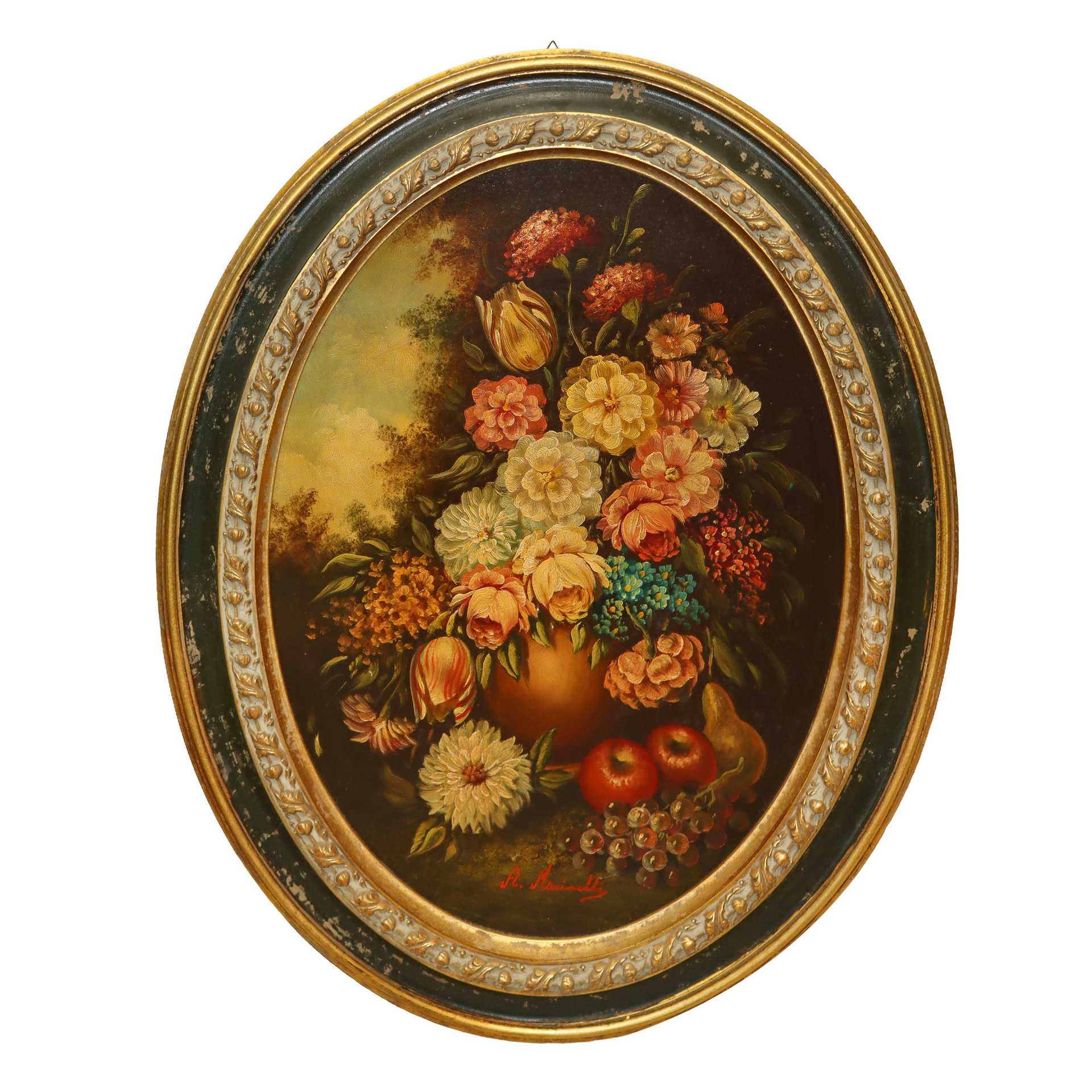 Andrea Marinelli (1819-1892) - Coppia di ovali con fiori 69X49 in cornice 89X69 olio su tavola Firmato