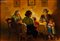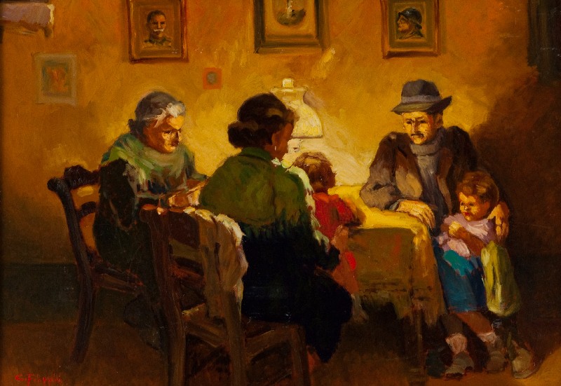 Cafiero Filippelli (Livorno 1889 - 1973) INTERNO CON FIGURE Olio su tavola, cm. 50x70 Firmato in basso a sinistra. Sul verso: timbro "Galleria d'Arte La Pantera".