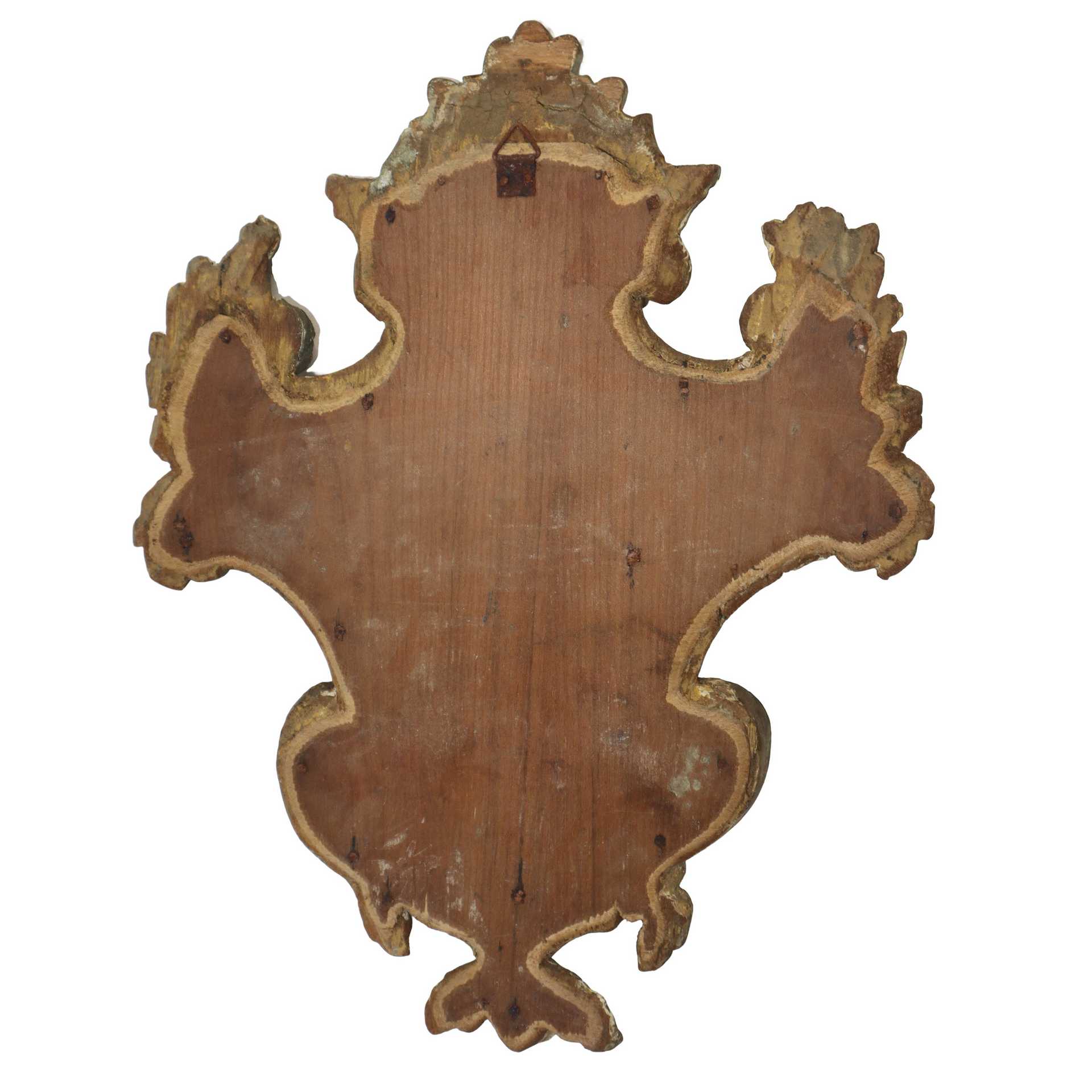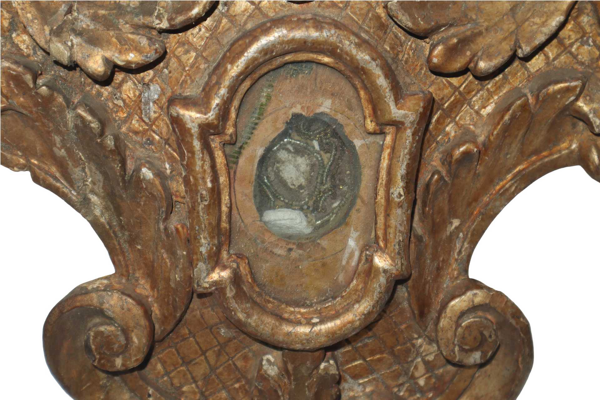 Reliquiario in legno dorato, argento e mistura, 18° secolo h cm 37X30 Incollatura sulla parte apicale Incollatura sulla parte apicale