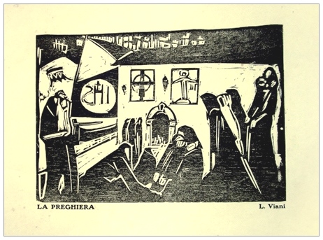 LORENZO VIANI Viareggio 1882 – Ostia 1936 La preghiera 1916 Xilografia. Firma (stampata) in b. a d., titolo in b. a s. (35 x 50 foglio – 19,8 x 29 xilo.) L’opera fa parte della cartella “Il martirio” composta da 12 xilografie tratte dagli studi del quadro “La Benedizione dei morti nel mare” che l’artista fece per la Casa Comunale del suo paese (Viareggio). Opere stampate presso la tipografia O. Ciani, Viareggio, 1916.