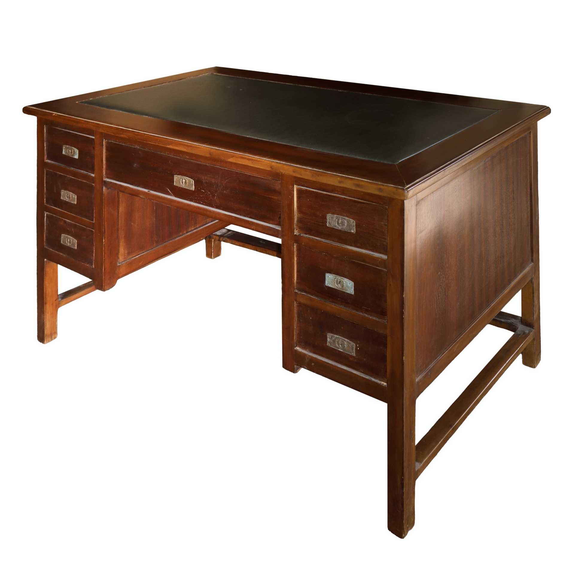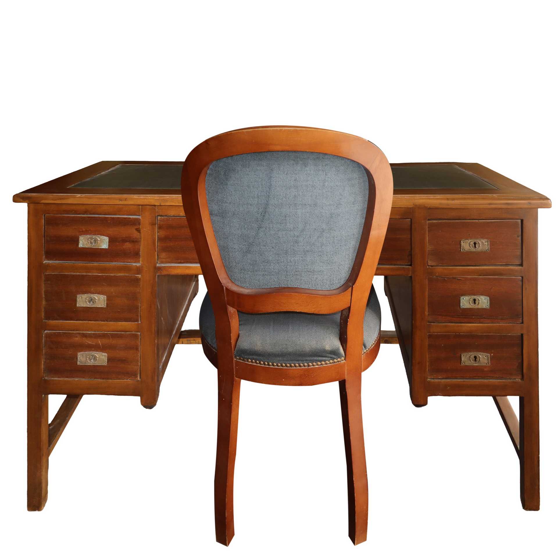 Scrittoio con sedia in legno di mogano, primi 19° secolo scrittoio H cm 80x130x60 - sedia H cm 100x49x45 Piano in similpelle verde, tre cassetti per lato e uno centrale con sedia in legno.Piano in similpelle verde, tre cassetti per lato e uno centrale con sedia in legno.