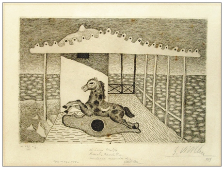 GIUSEPPE VIVIANI Agnano Pisano 1898 – Pisa 1965 Cavallino a dondolo 1949 Acquaforte su rame es.XXX/50. Firma e data in b. a d.; dedica, località e data in b. al c.; altra firma e data sulla lastra in b. a d. Pubbl.: “Viviani Opera Incisoria Catalogo Generale” cat. a cura di Nicola Micieli e Silvio Guarasci, Editore Bandecchi e Vivaldi, Pontedera, 1998, tav.94, p.194.