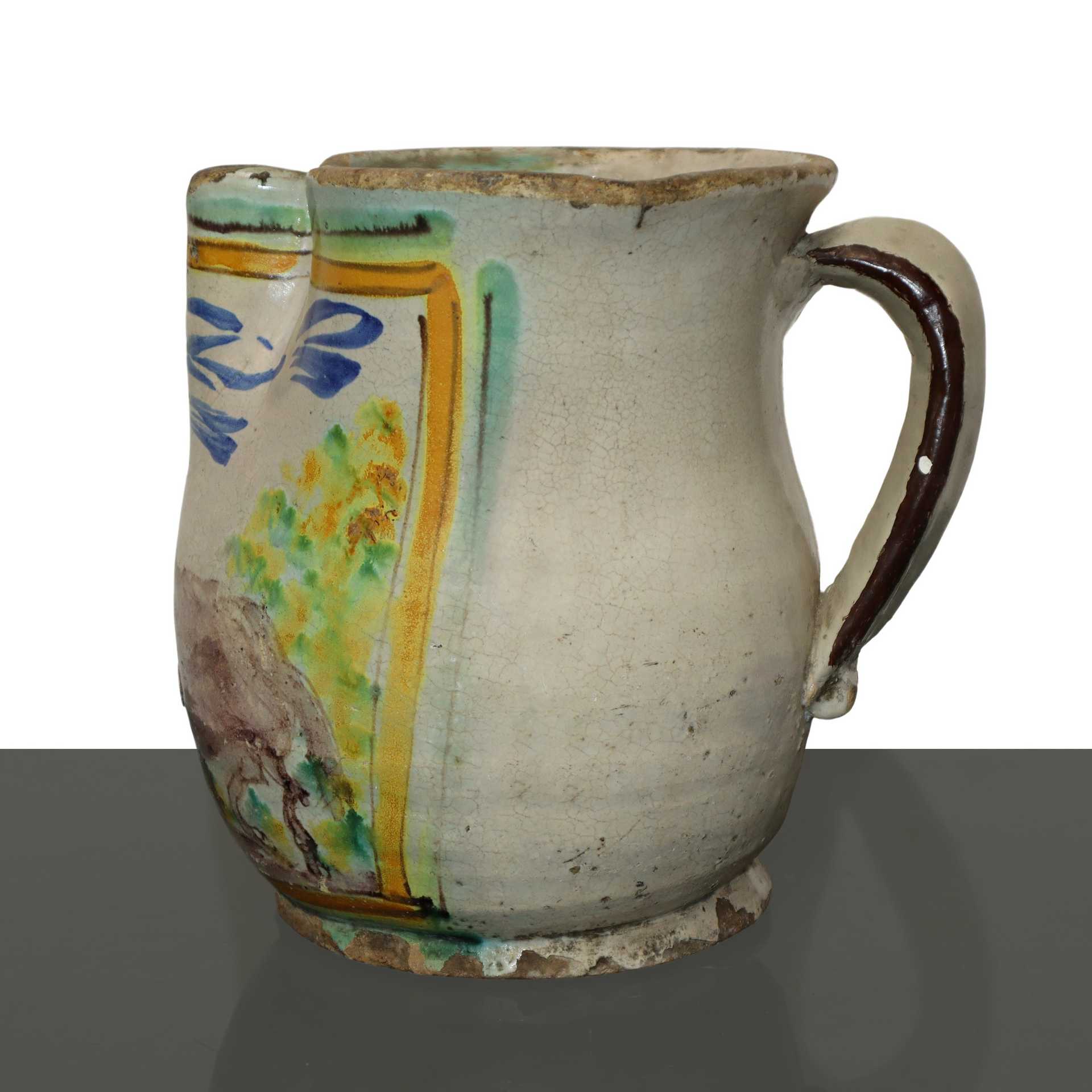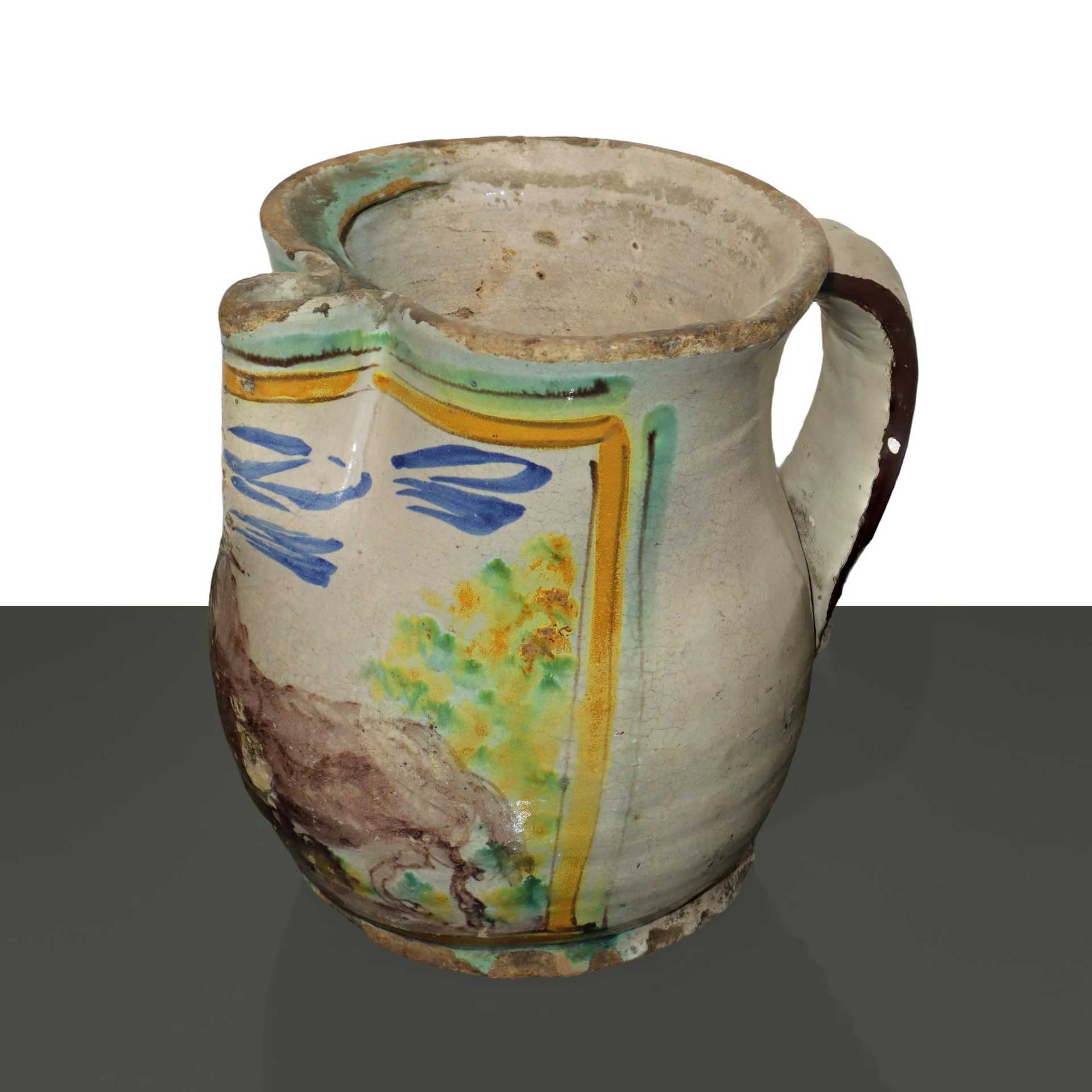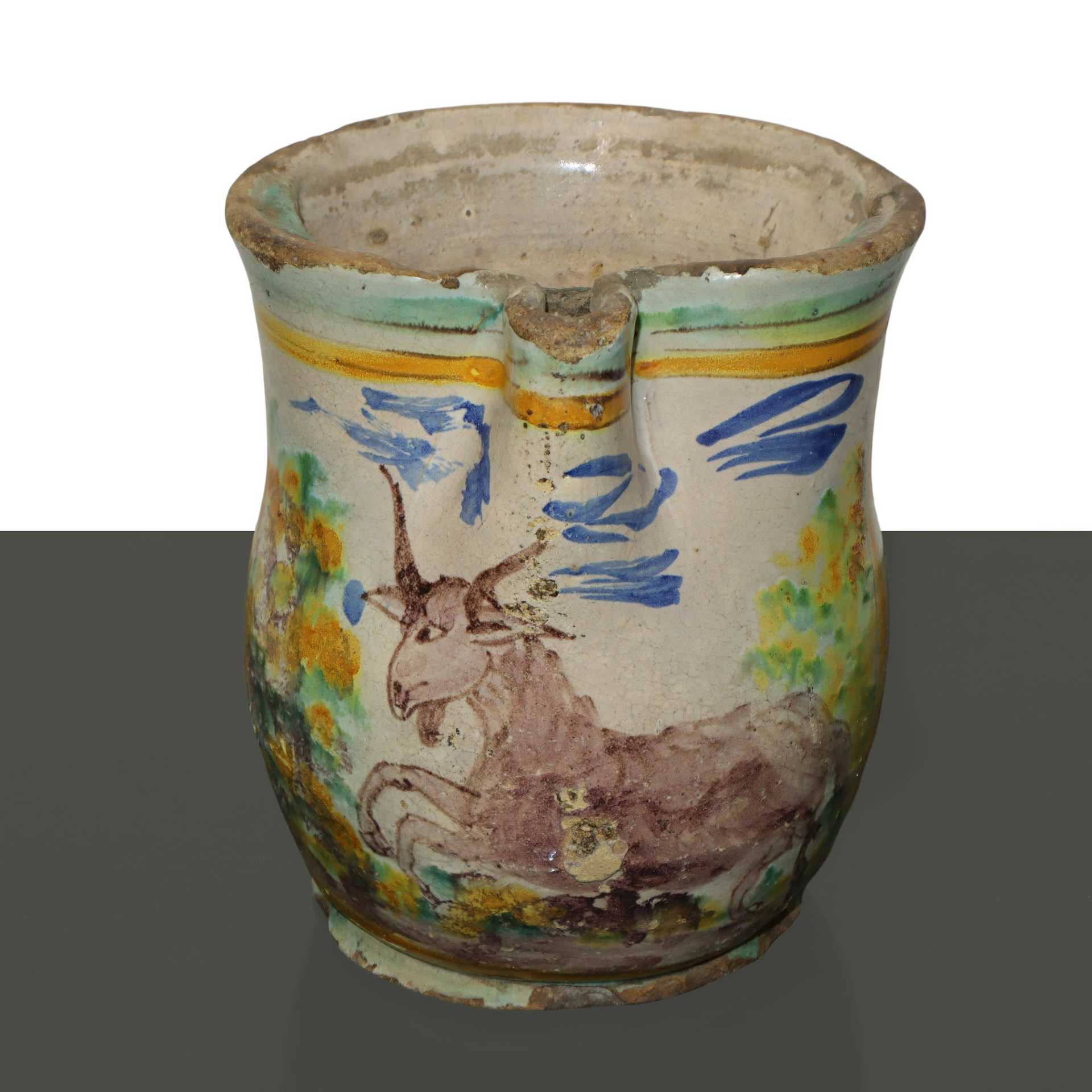 Cannata in ceramica di Caltagirone con caprone dipinto sul fronte, 19th/20° secolo
