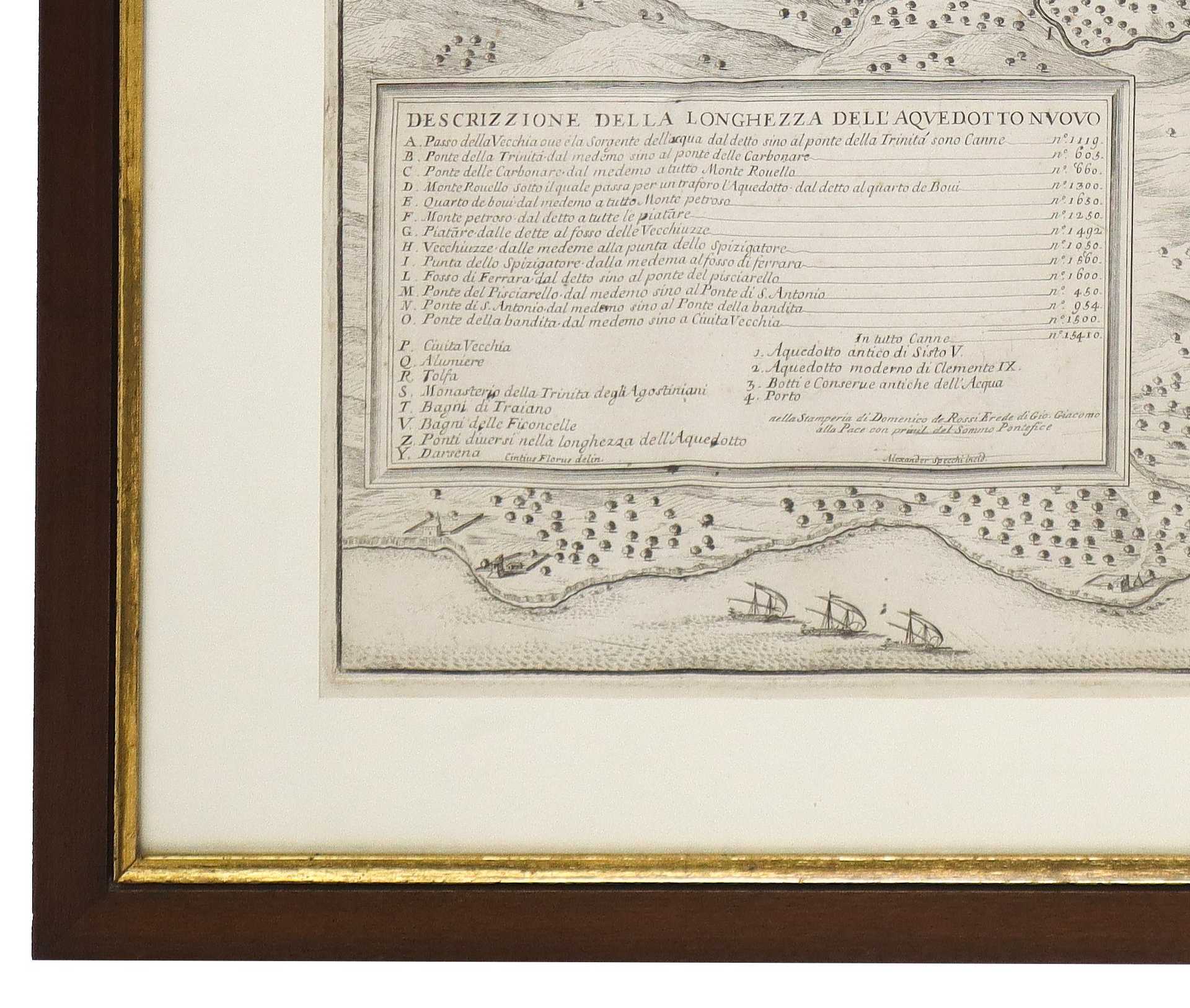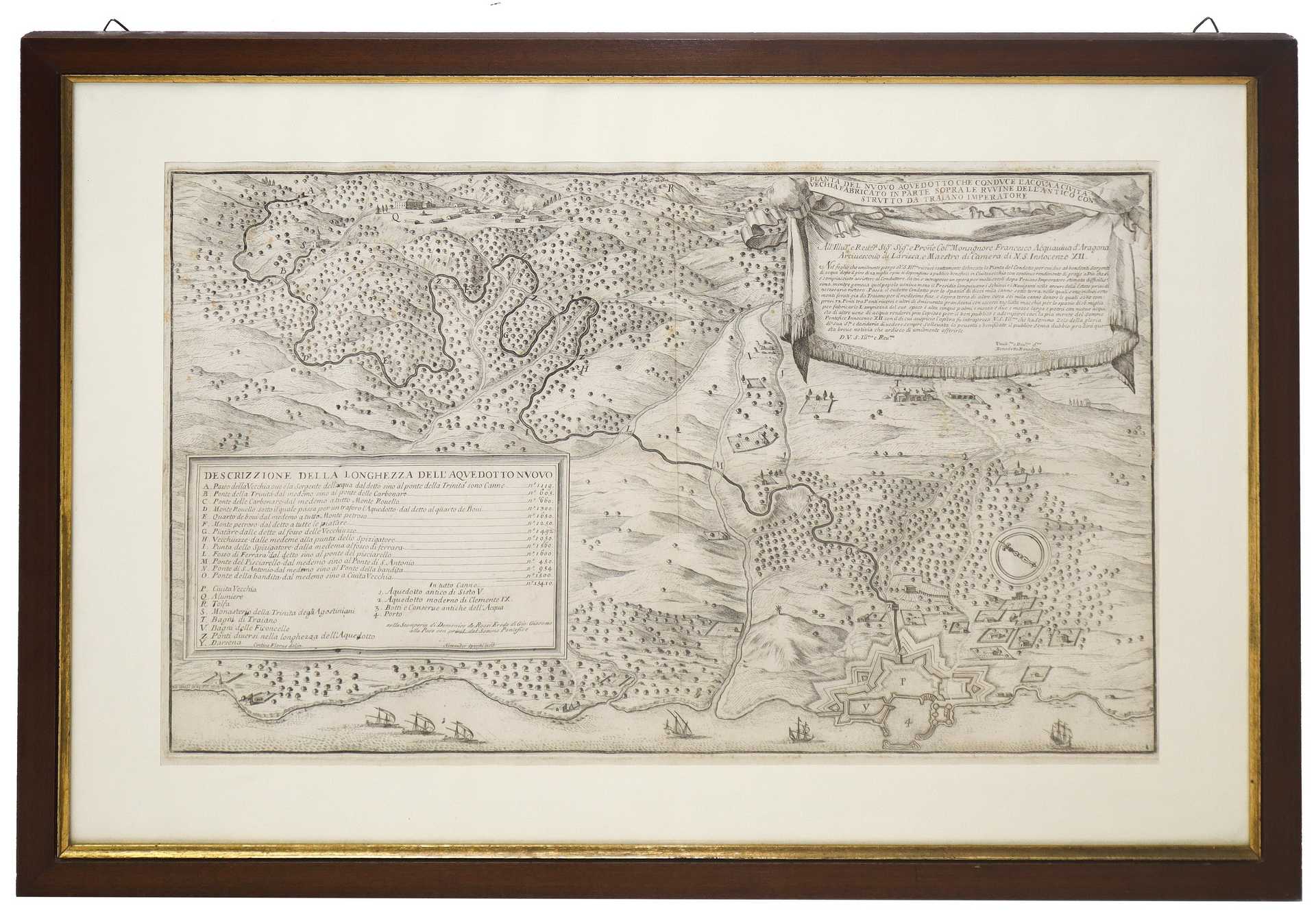 “Pianta del nuovo aquedotto che conduce l'acqua a Civitavecchia fabricato in parte sopra le ruvine dell'antico construtto da Traiano Imperatore” cm 35 (h) x 55 (L) Senza cornice, 49 x 71 cm con cornice.
