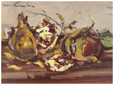 MASANIELLO LUSCHI Livorno 1942 – 1995 ..autunnali 1976 Olio su tavola 16 x 21,8. Firma in a. a s.; sul verso scritte illeggibili, firma, data e titolo parzialmente leggibile + timbro “Collezione privata”.