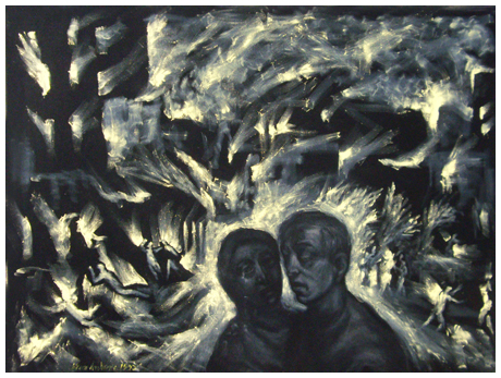 SILVANO D’AMBROSIO Hayange (Francia) 1951 Senza titolo 1993 Olio su velluto accoppiato a tela 90 x 120. Firma e data in b. a s.; sul verso firma e dicitura “per la mostra Sogno d’ombra”. Certificato di garanzia con timbro e firma galleria Il bello dell’arte, Rudiano su foto. Foto con timbro e firma galleria Manuela Allegrini, Brescia.