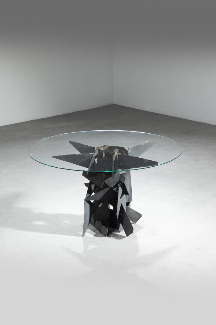 Base in ferro lavorato e piano in vetro.