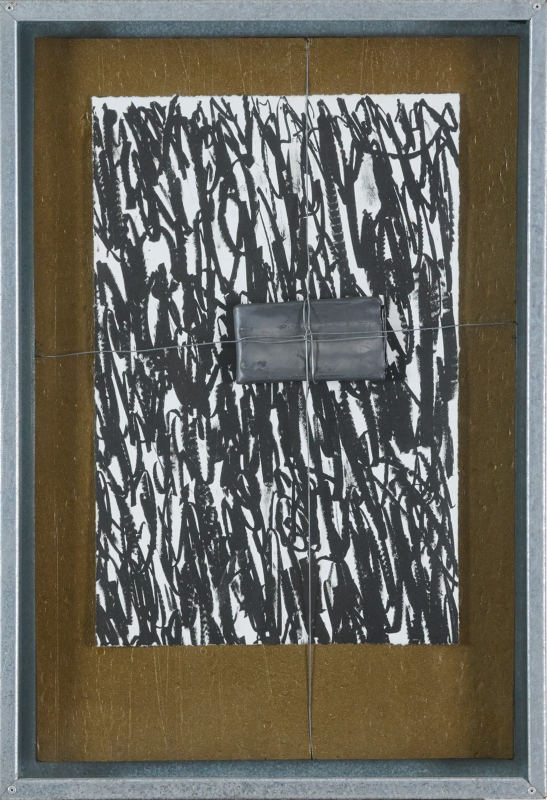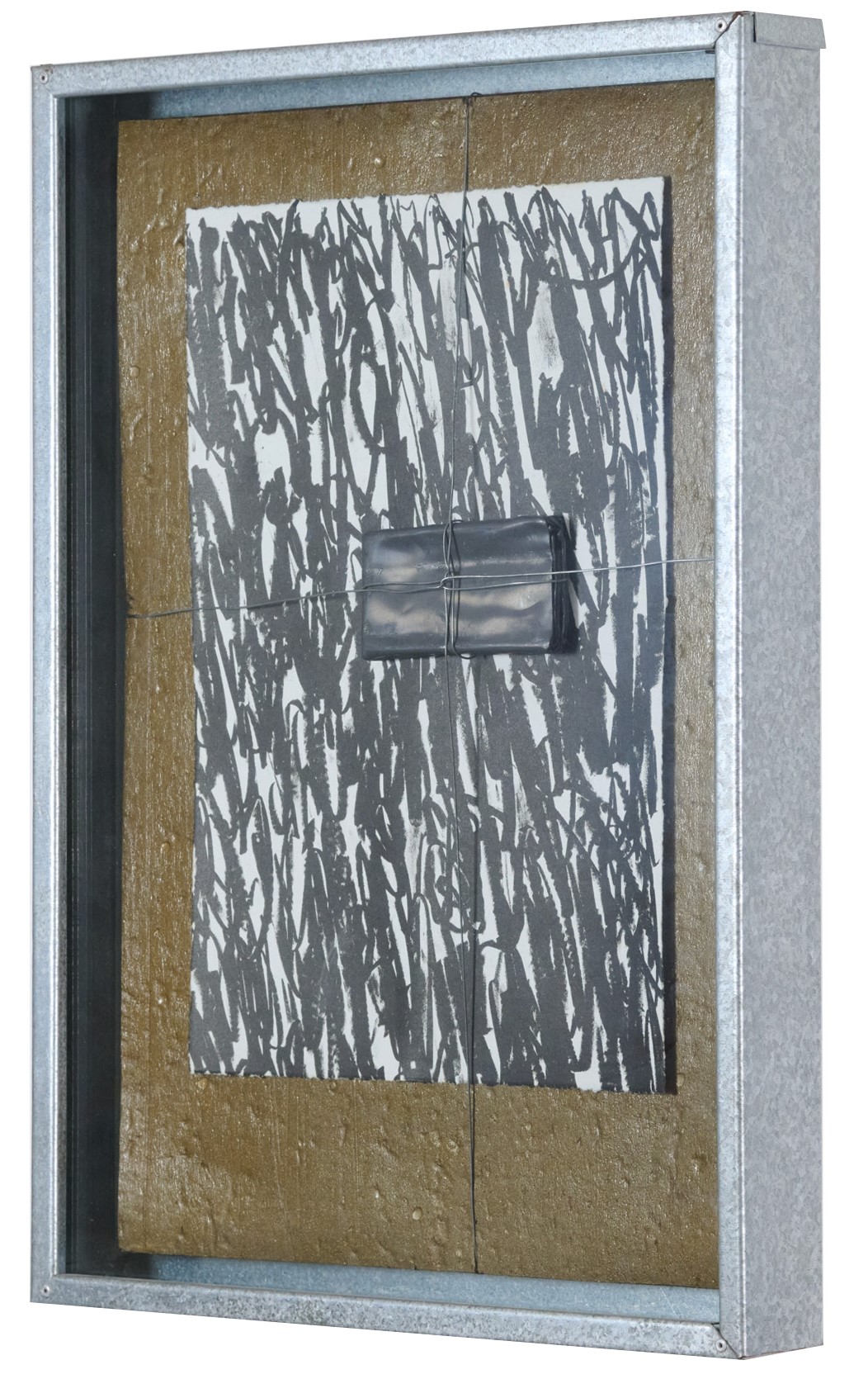 Carbone minerale applicato su linoincisione in scatola di ferro zincata incisione