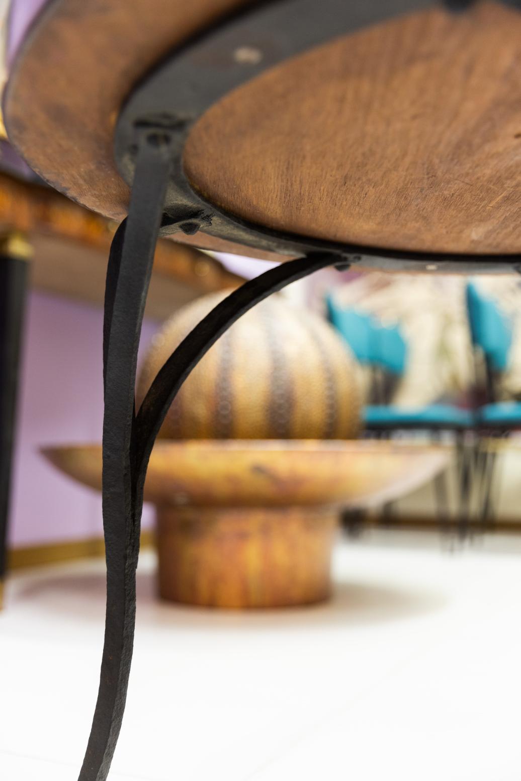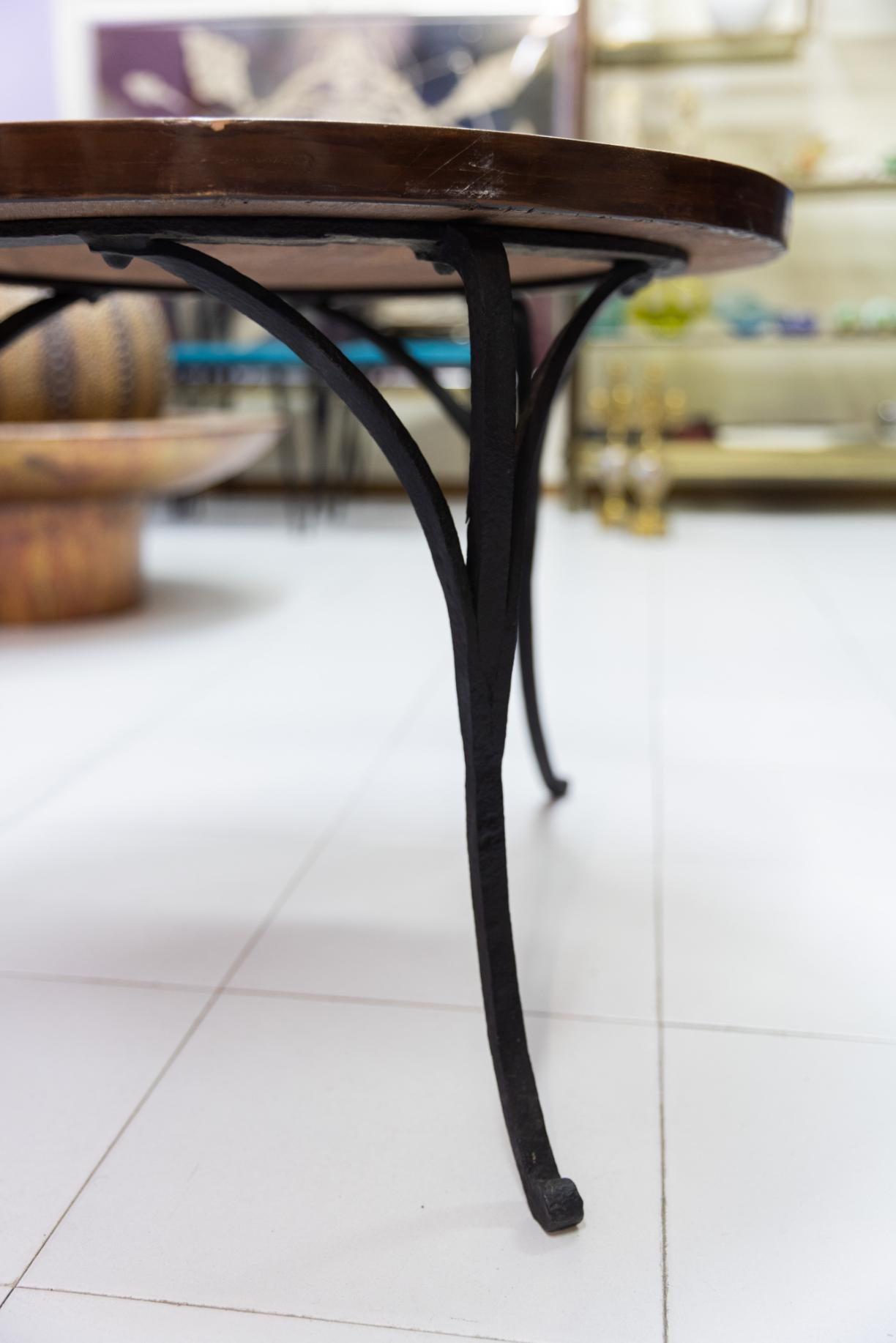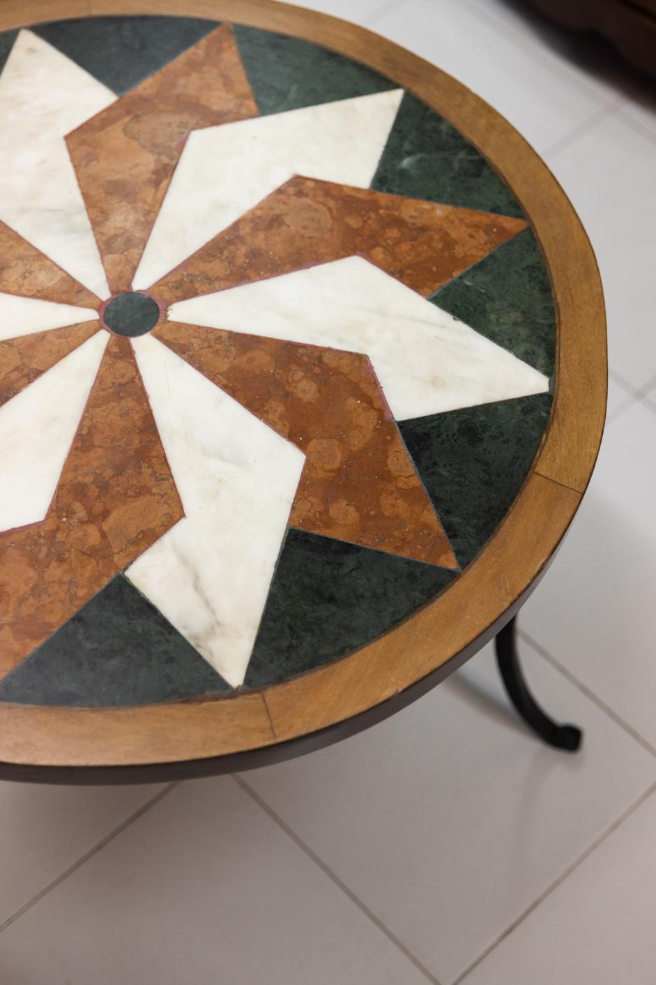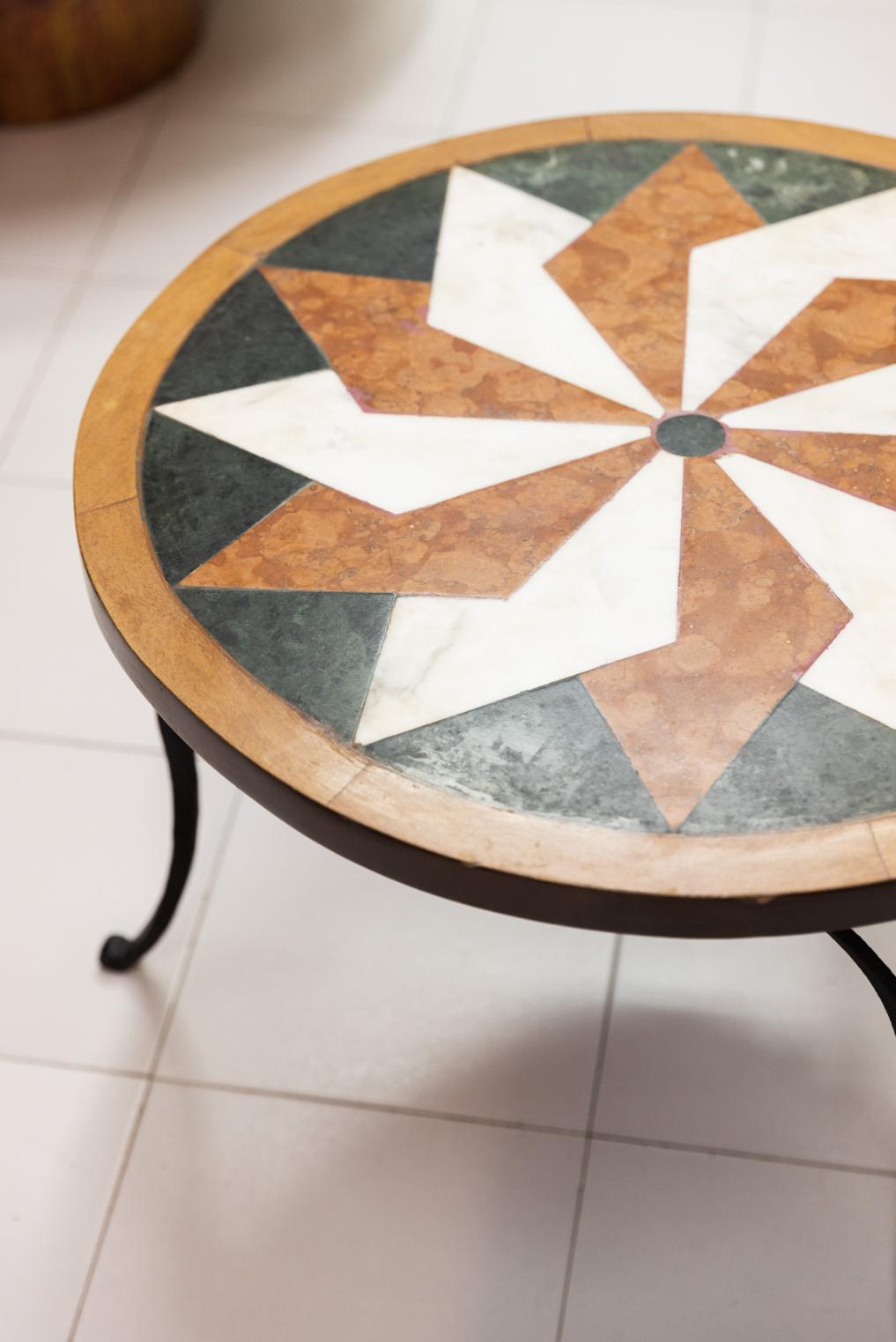 Tavolino da caffè in ferro battuto e mosaico di marmi policromi,