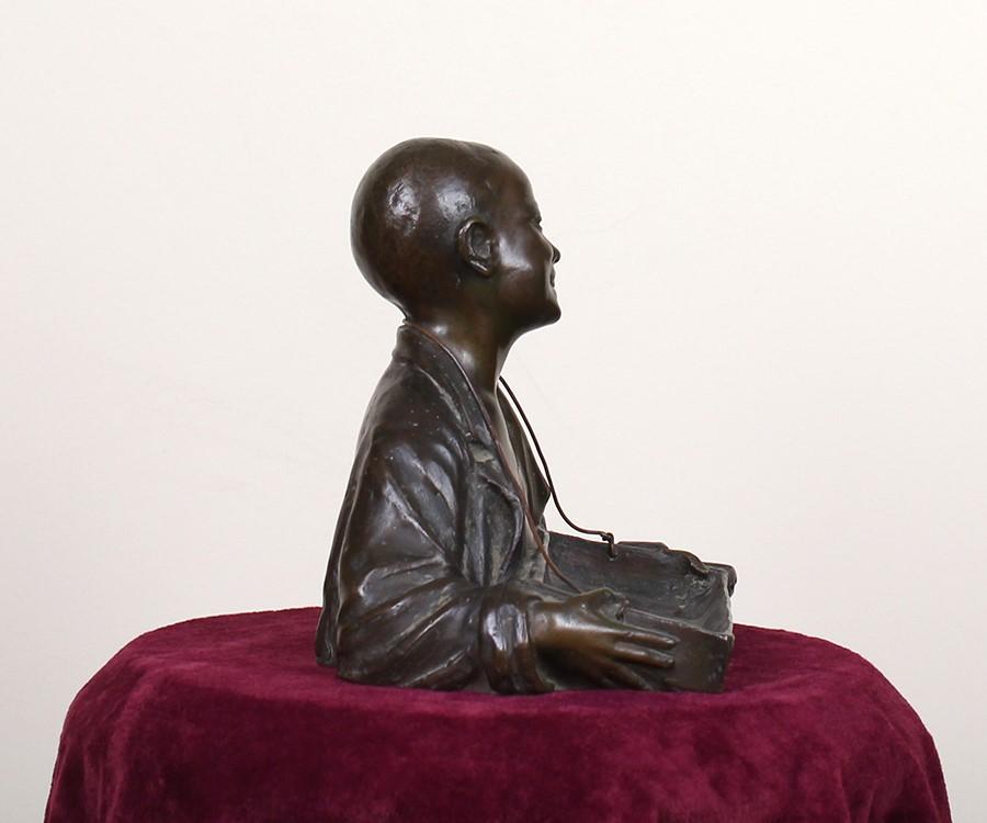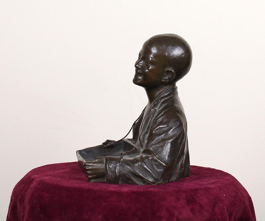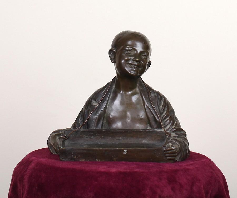 Statua raffigurante mezzo busto di ragazzo con scatola porta sigarette in bronzo, 1950 ca