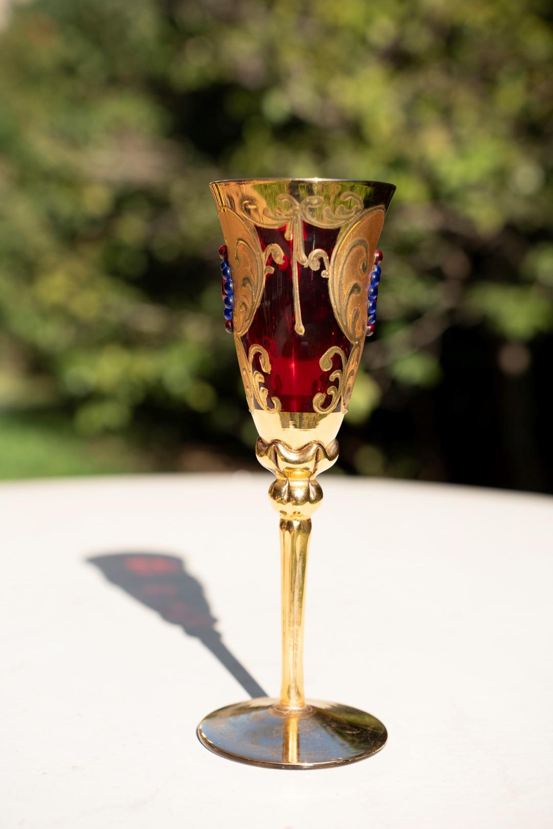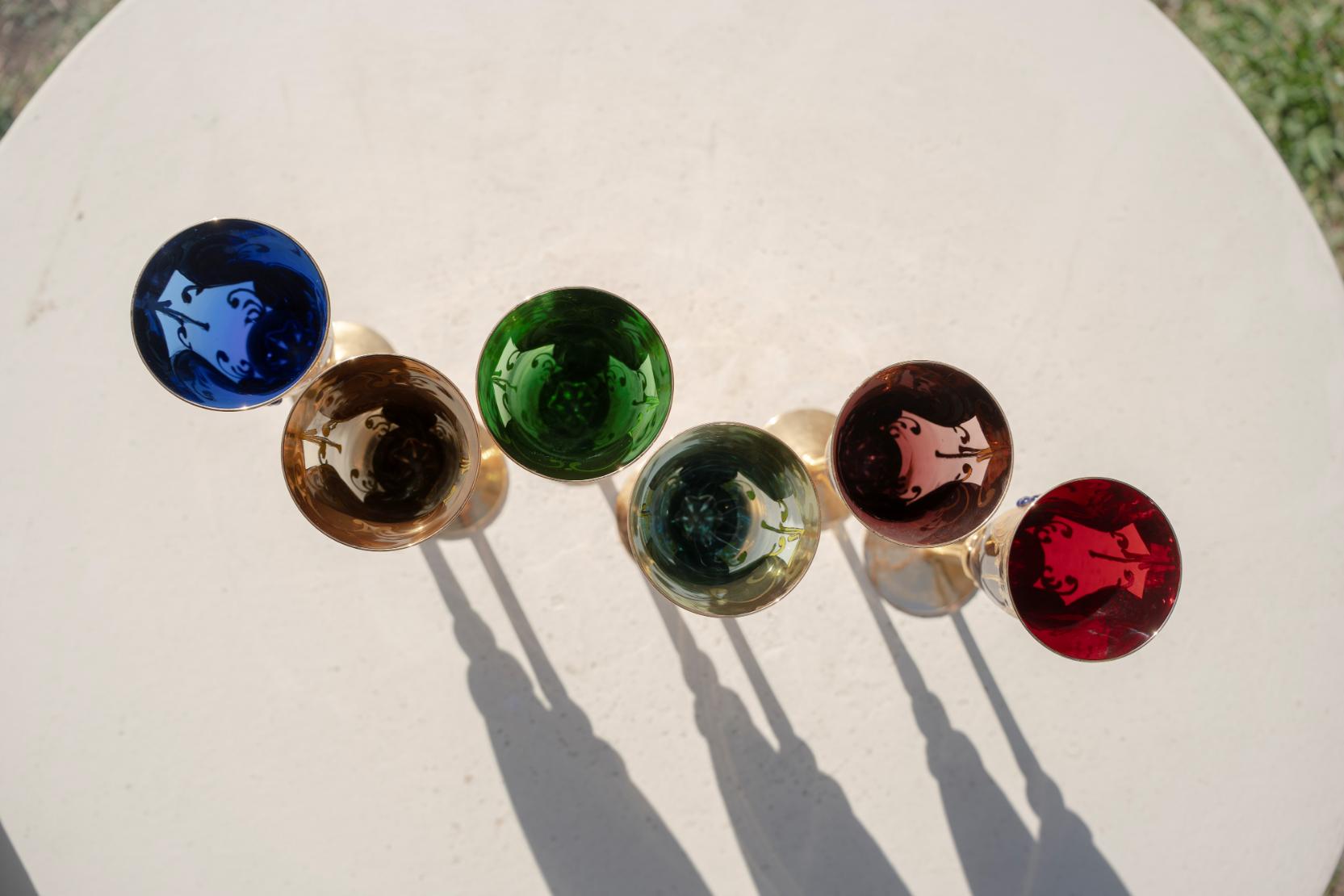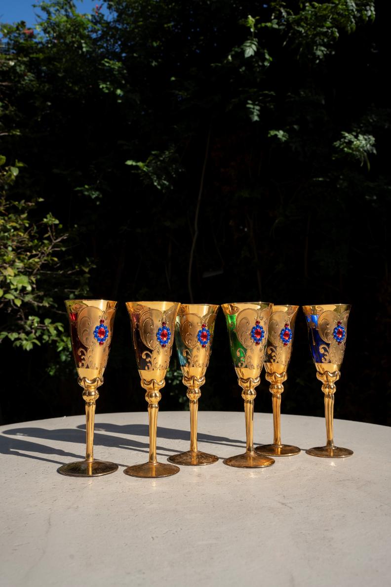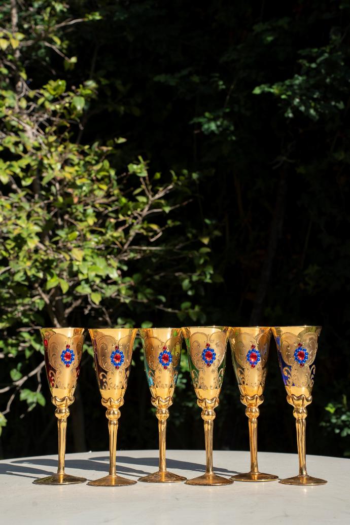 N. 6 bicchieri da champagne in vetro di Murano in smalto e foglia oro 24kt, XX secolo
