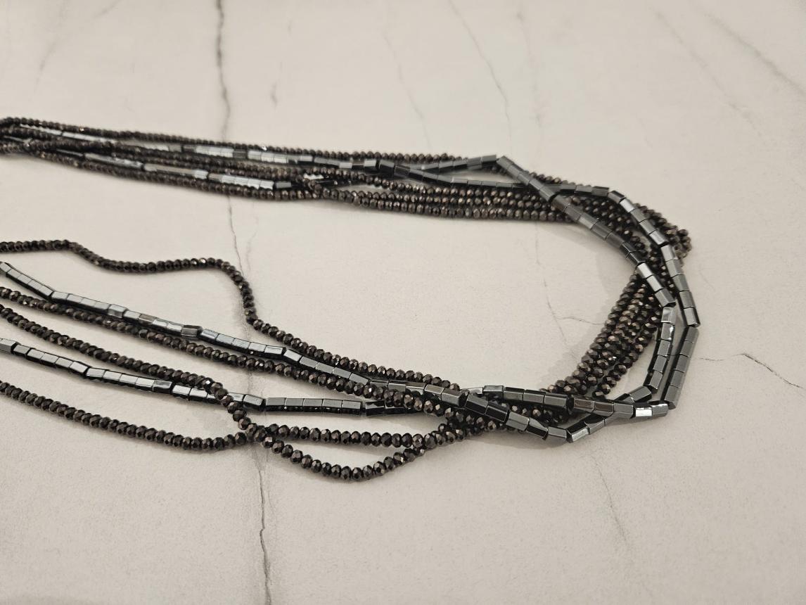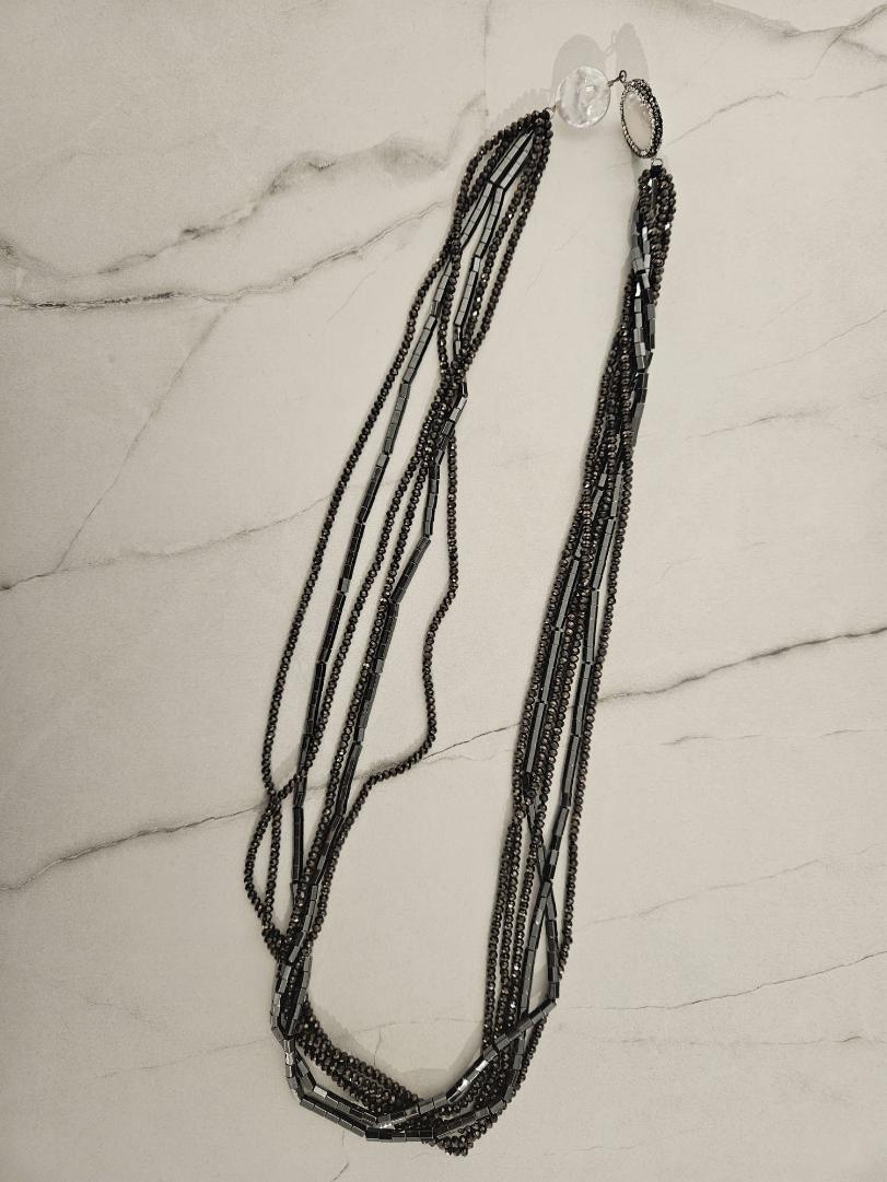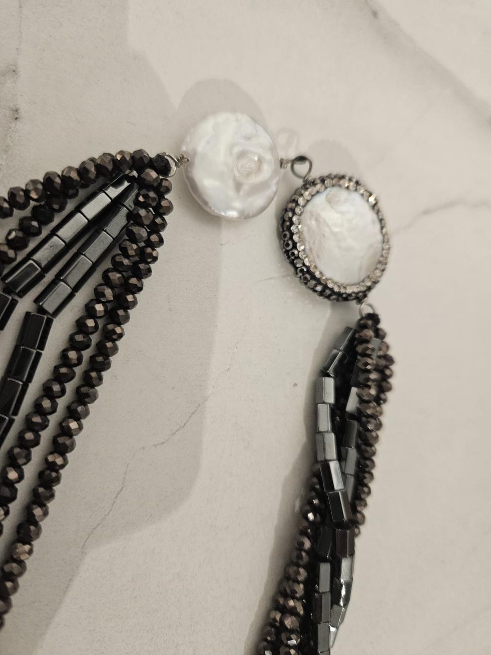 Lot 179 | Collana nera con pietre piatte simil madreperla e perline nere e grigie