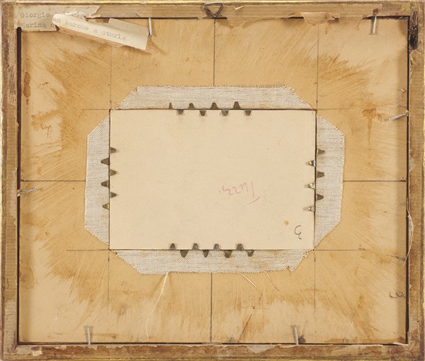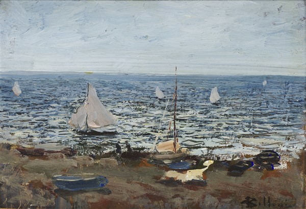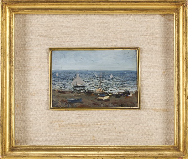 Giorgio Belloni "Marina con barche a Sturla" olio su cartoncino (cm 8,5x12,5) f