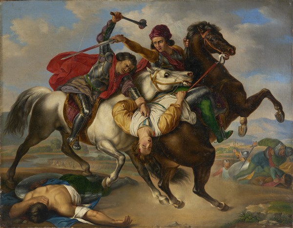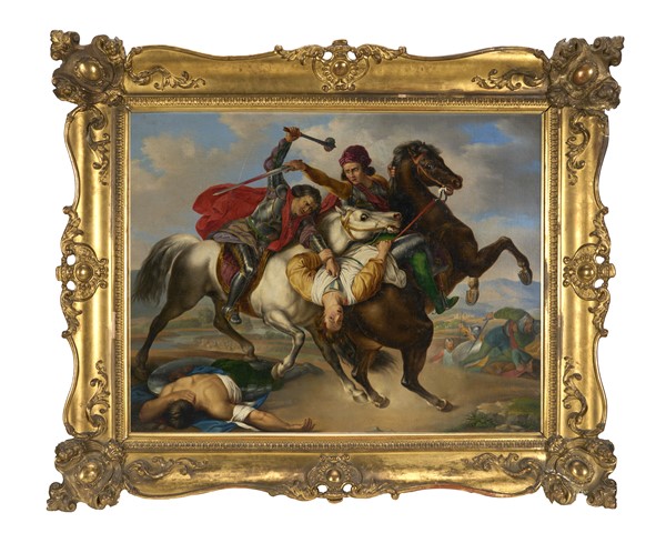 Scuola del secolo XIX "Farinata degli Uberti alla battaglia del Serchio" olio