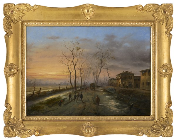 Ignoto lombardo del secolo XIX "Paesaggio al tramonto" olio su tela (cm 27x38