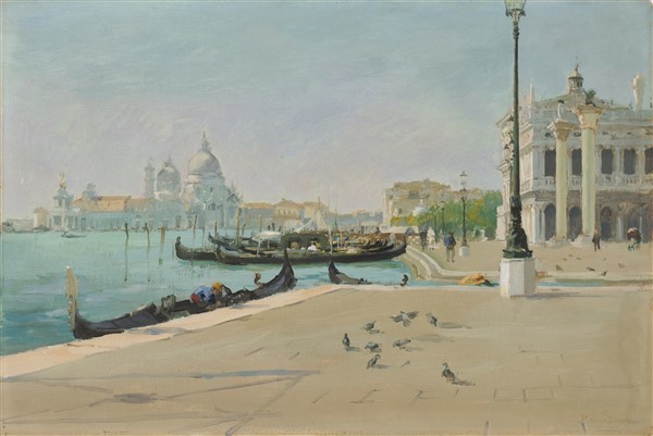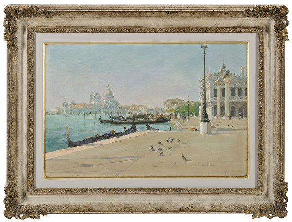 Italico Brass "Veduta di Venezia, verso Punta della Dogana" olio su cartone (cm
