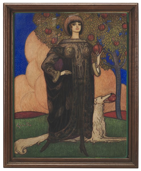 Giovanni Grande "Figura femminile con cane e melograno" tecnica mista su carta