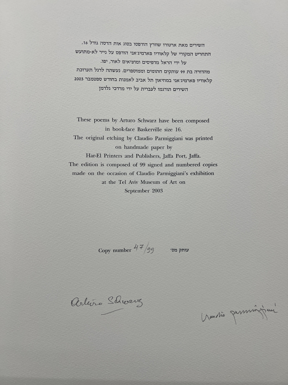 Firme di Arturo Schwarz e Claudio Parmiggiani e numerazione (Esemplare 47/99) a matita sul colophon