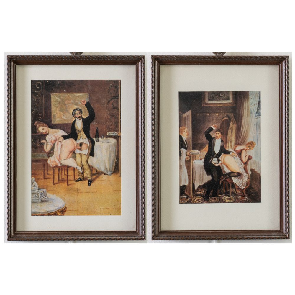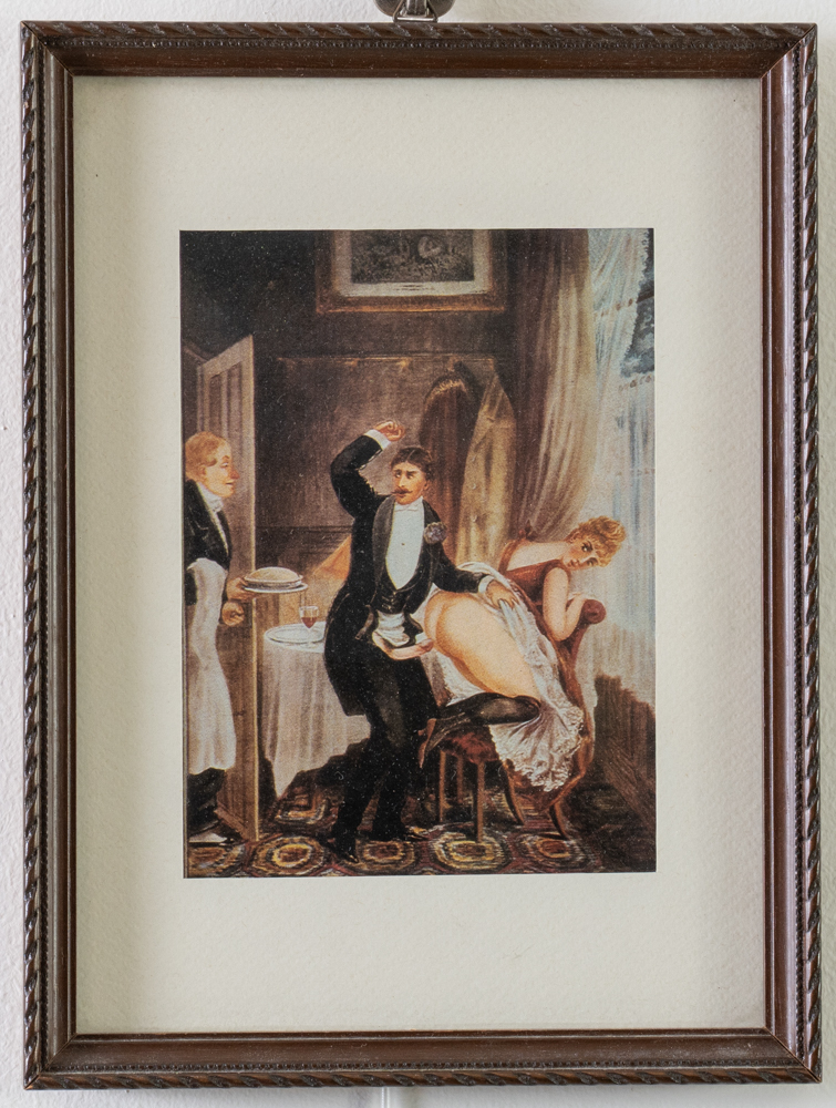 Le ostriche e Pietanza fumante.Due stampe di scene erotiche, probabilmente facenti parte di una serie, raffiguranti il cameriere mentre porta alla coppia l'ennesima portata: ostriche, cibo considerato afrodisiaco o altra pietanza fumante. Ciascuno cm. 14,5x11.