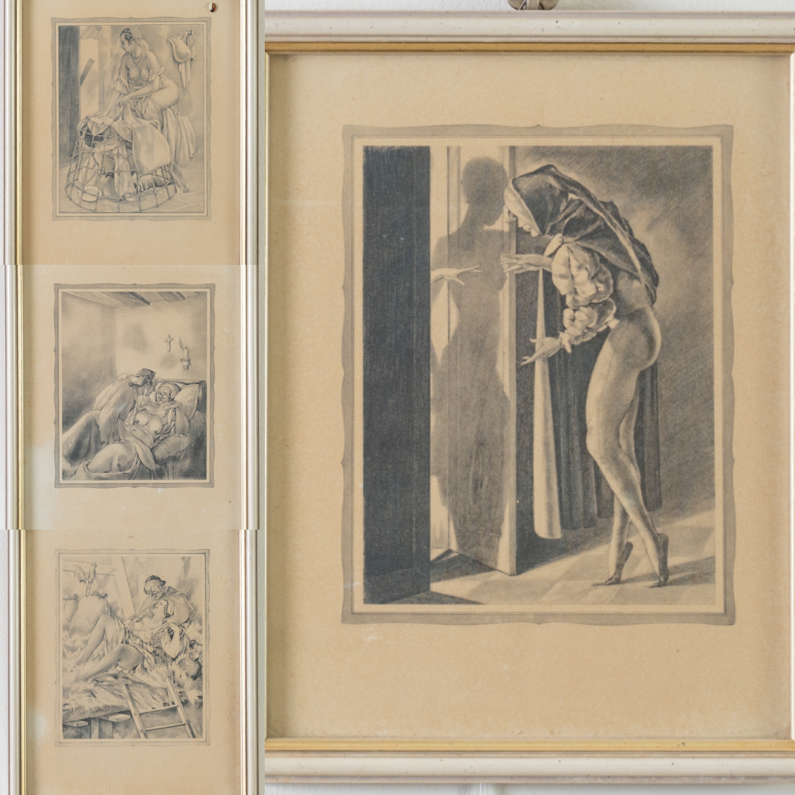 Da Umberto Brunelleschi (Montemurlo 1879 - Parigi 1949). Lotto di quattro stampe su carta. Illustrazioni realizzate da Brunelleschi per Les contes de Boccace e Mémoire de Casanova editi da Gilbert Jeune Librairie d'Amateurs, Parigi, anni 1934 e 1941 circa. Ciascuno cm. 28,5x22,5.