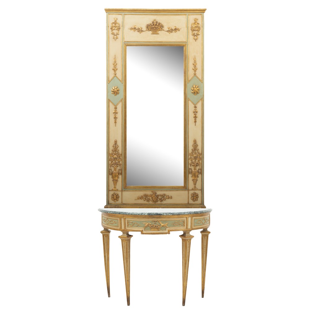 Consolle con specchiera stile Luigi XVI in legno laccato e dorato, piano in marmo verde delle alpi.